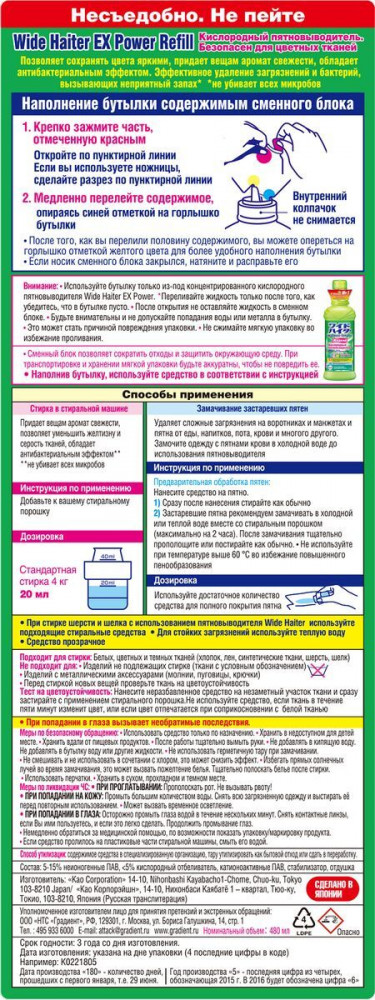 Attack Пятновыводитель жидкий кислородный сменный блокВ данный момент этот товар отсутствует в продаже. Возможно, у нас найдется аналогичный или похожий товар здесь. Серия: Wide haiter ex Пятновыводитель Wide Haiter «EX Power» подходит для стирки белых, темных и цветных тканей (хлопок, лен, синтетика, шерсть, шелк). Обеспечивает белизну белых вещей и яркость цветных. Эффективно удаляет загрязнения и убивает микробы в холодной воде. Удаляет даже въевшиеся загрязнения. Обладает длительным антибактериальным и дезодорирующим эффектом. Глубоко проникает в волокна тканей и устраняет загрязнения и бактерии, вызывающие неприятный запах. Можно использовать как на отдельных загрязненных участках, так и добавлять во время стирки в стиральной машине. Не содержит агрессивных химикатов (например, хлор), имеет нежный аромат. |