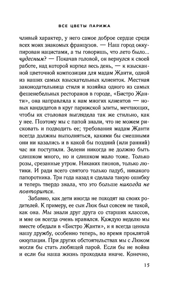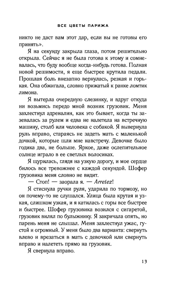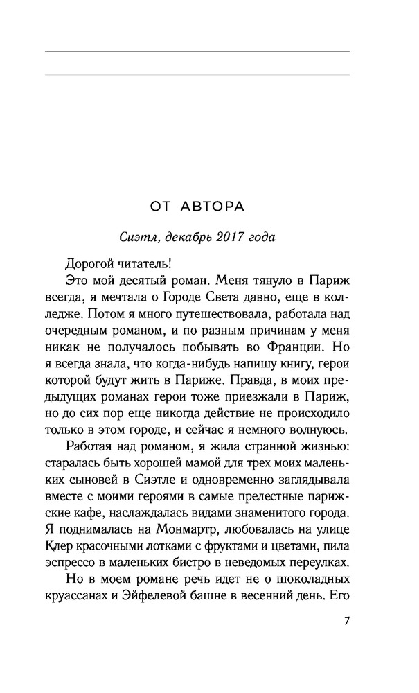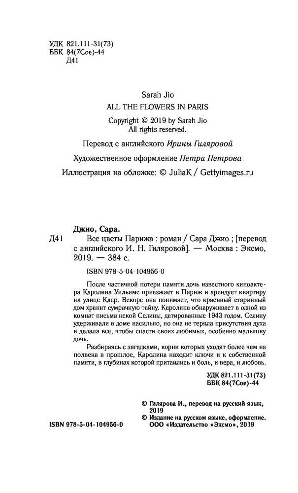 Все цветы ПарижаВ данный момент этот товар отсутствует в продаже. Возможно, у нас найдется аналогичный или похожий товар здесь. Серия: Зарубежный романтический бестселлер. Романы Сары Джио и Карен Уайт После частичной потери памяти дочь известного киноактера Каролина Уильямс приезжает в Париж и арендует квартиру на улице Клер. Вскоре она понимает, что красивый старинный дом хранит сумрачную тайну. Каролина обнаруживает в одной из комнат письма некой Селины, датированные 1943 годом. Селину удерживали в доме насильно, но она не теряла присутствия духа и делала все, чтобы спасти своих любимых, особенно малышку дочь. Разбираясь с загадками, корни которых уходят более чем на полвека в прошлое, Каролина находит ключи и к собственной памяти, в глубинах которой притаились и боль, и вера, и любовь. |