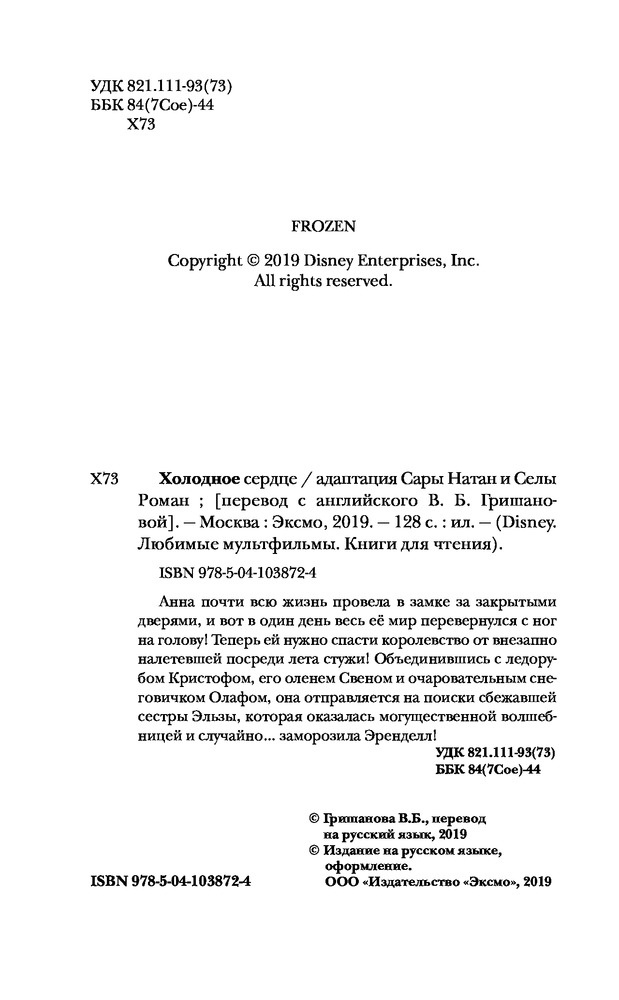 Холодное сердце (выпуск 1)В данный момент этот товар отсутствует в продаже. Возможно, у нас найдется аналогичный или похожий товар здесь. Серия: Детская. Disney. Любимые мультфильмы. Книги для чтения Анна почти всю жизнь провела в замке за закрытыми дверями, и вот в один день весь её мир перевернулся с ног на голову! Теперь ей нужно спасти королевство от внезапно налетевшей посреди лета стужи! Объединившись с ледорубом Кристофом, его оленем Свеном и очаровательным снеговичком Олафом, она отправляется на поиски сбежавшей сестры Эльзы, коротая оказалась могущественной волшебницей и случайно... заморозила Эренделл! |