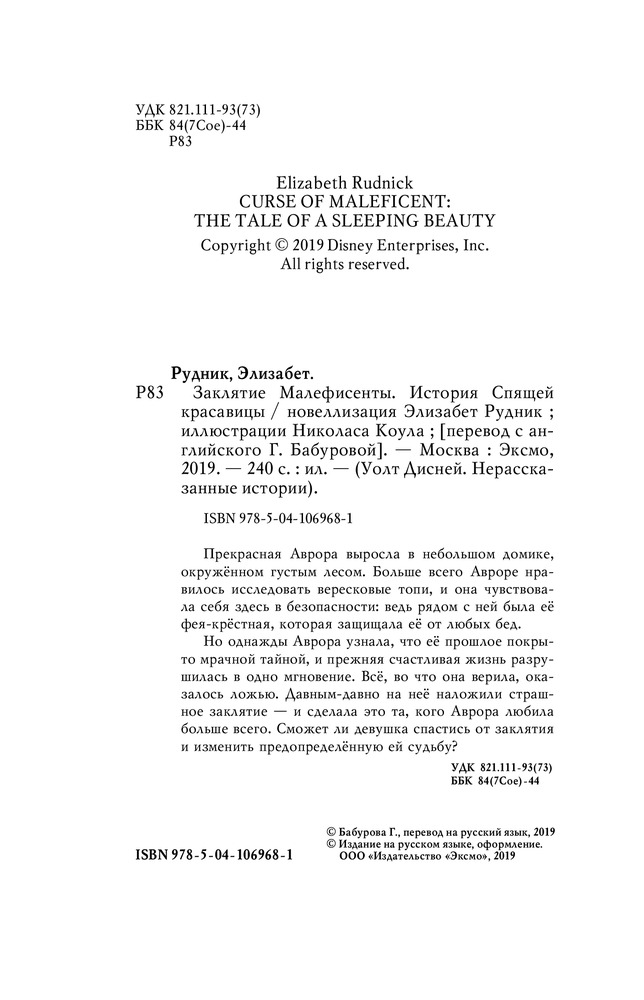 Заклятие Малефисенты. История Спящей красавицыВ данный момент этот товар отсутствует в продаже. Возможно, у нас найдется аналогичный или похожий товар здесь. Серия: Детск. Уолт Дисней. Нерасcказанные истории Прекрасная Аврора выросла в небольшом домике, окружённом густым лесом. Больше всего Авроре нравилось исследовать вересковые топи, и она чувствовала себя здесь в безопасности: ведь рядом с ней была её фея-крёстная, которая защищала её от любых бед. Но однажды Аврора узнала, что её прошлое покрыто мрачной тайной, и прежняя счастливая жизнь разрушилась в одно мгновение. Всё, во что она верила, оказалось ложью. Давным-давно на неё наложили страшное заклятие — и сделала это та, кого Аврора любила больше всего. Сможет ли девушка спастись от заклятия и изменить предопределённую ей судьбу? |