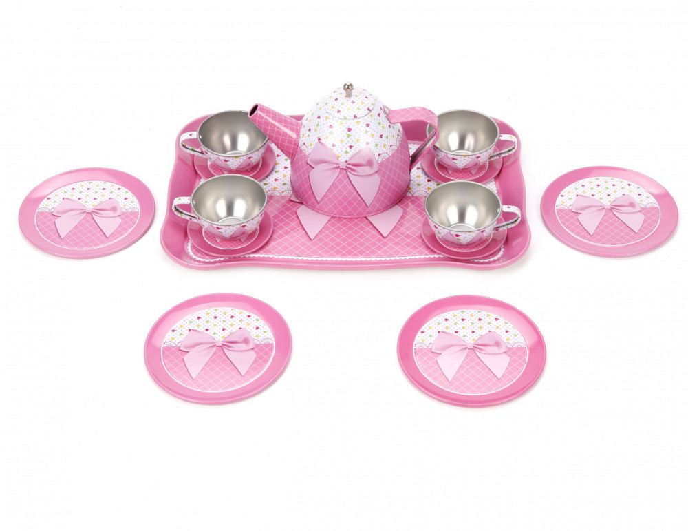 Набор металлической посуды для кукол «Розовый бант» из эксклюзивной коллекции «Five o’clock». Игрушки будут развивать у будущей леди фантазию, воображение, коммуникативные способности и хорошие манеры.