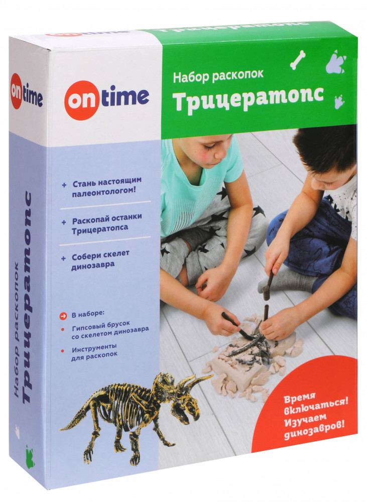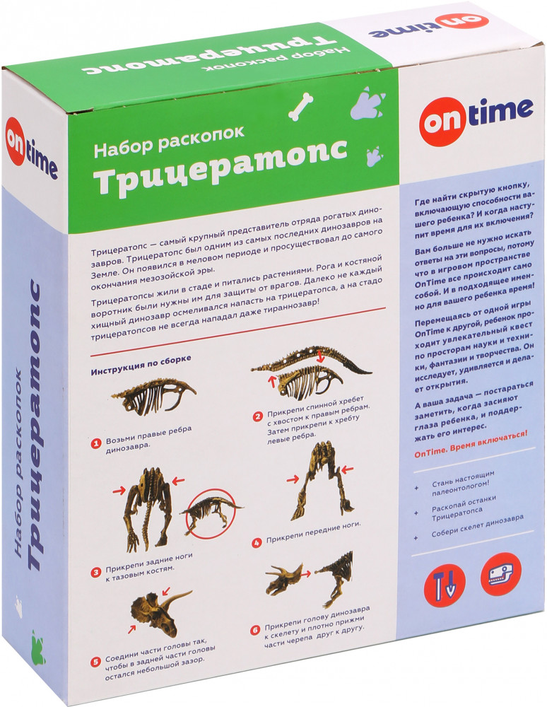 Ребёнку предстоит раскопать останки Трицератопса и собрать из них скелет. Инструкция по сборке имеется на обороте упаковки. В игровой форме маленький исследователь расширит кругозор и пополнит свои знания о динозаврах.