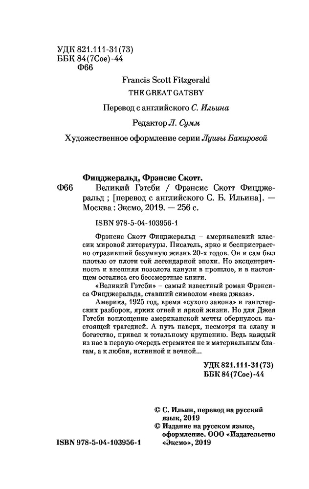Великий ГэтсбиВ данный момент этот товар отсутствует в продаже. Возможно, у нас найдется аналогичный или похожий товар здесь. Серия: Белая птица Фрэнсис Скотт Фицджеральд — американский классик мировой литературы. Писатель, ярко и беспристрастно отразивший безумную жизнь 20-х годов. Он и сам был плотью от плоти той легендарной эпохи. Но эксцентричность и внешняя позолота канули в прошлое, и в настоящем остались его бессмертные книги. «Великий Гэтсби» — самый известный роман Фрэнсиса Фицджеральда, ставший символом «века джаза». Америка, 1925 год, время «сухого закона» и гангстерских разборок, ярких огней и яркой жизни. Но для Джея Гэтсби воплощение американской мечты обернулось настоящей трагедией. А путь наверх, несмотря на славу и богатство, привел к тотальному крушению. Ведь каждый из нас в первую очередь стремится не к материальным благам, а к любви, истинной и вечной... |