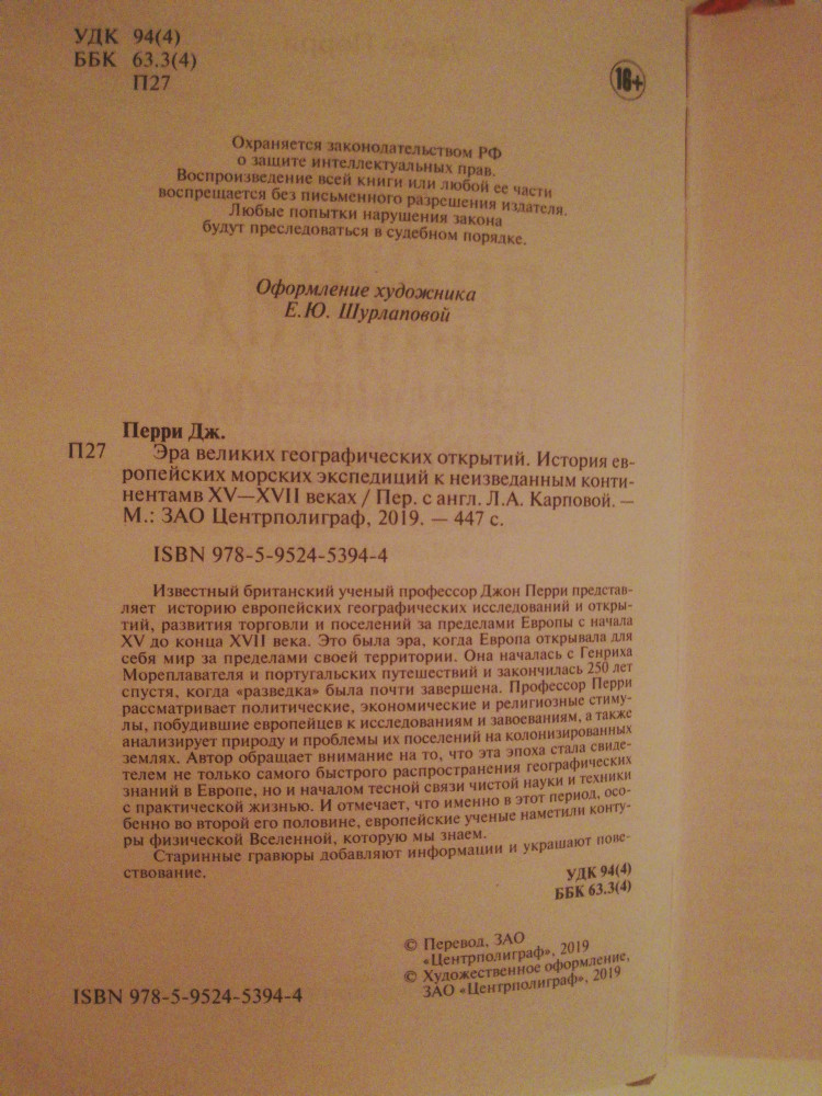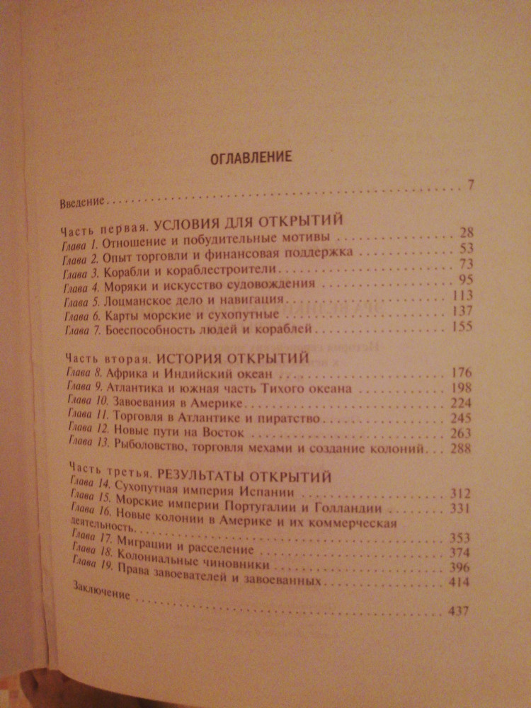 Более подробной книги о великих географических открытиях я не читал. Поразила подробная описание всего, что связывала с эрой открытий. Одно лишь описание парусного вооружений кораблей в начале книги вводить ступор тех, кто далек от такой тематики. И приходится гадать о чем идет речь. Ближе к середине и в конце книги описание истории данной эпохе, имевших место трудностей и их преодоление различними странами заслуживает отдельной похвалы. Повествование идет поэтапное и детальное. Удивляет только то, что автор больше уделяет внимание Испанской империей и ее методами колонизации Нового света. Остальные страны присутствуют лишь для сравнение (мне так показалось).