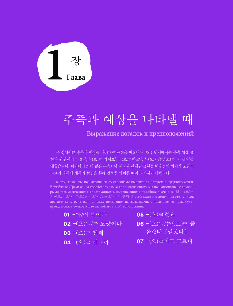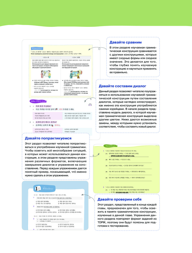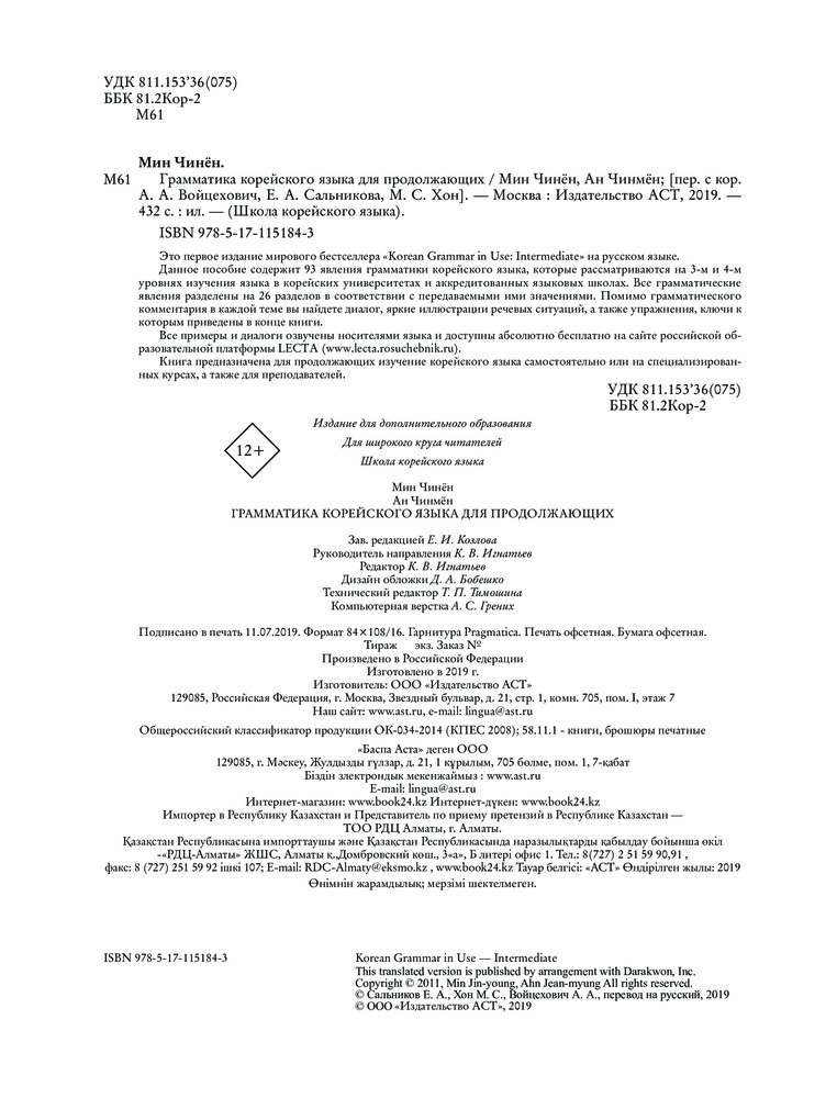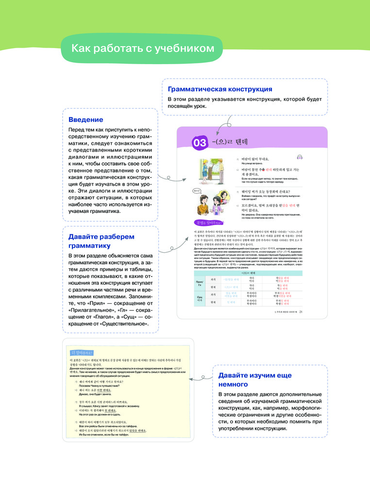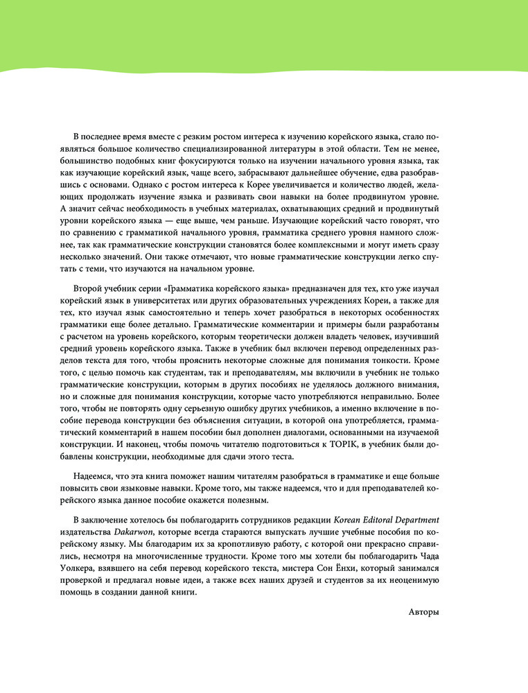 Серия: Школа корейского языка Это первое издание мирового бестселлера «Korean Grammar in Use: Intermediate» на русском языке. Данное пособие содержит 93 явления грамматики корейского языка, которые рассматриваются на 3-м и 4-м уровнях изучения языка в корейских университетах и аккредитованных языковых школах. Все грамматические явления разделены на 26 разделов в соответствии с передаваемыми ими значениями. Помимо грамматического комментария в каждой теме вы найдете диалог, яркие иллюстрации речевых ситуаций, а также упражнения, ключи к которым приведены в конце книги. Все примеры и диалоги озвучены носителями языка и доступны абсолютно бесплатно на сайте российской образовательной платформы Lecta. Книга предназначена для продолжающих изучение корейского языка самостоятельно или на специализированных курсах, а также для преподавателей. |