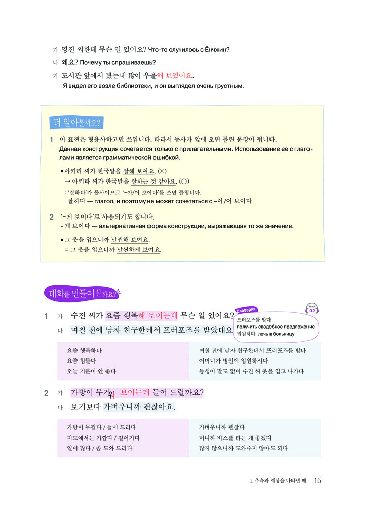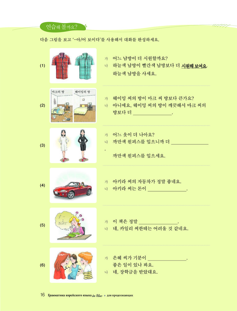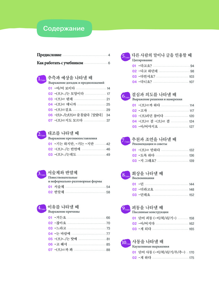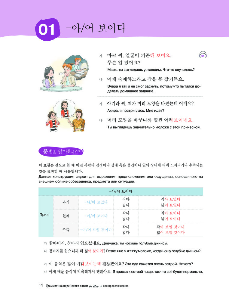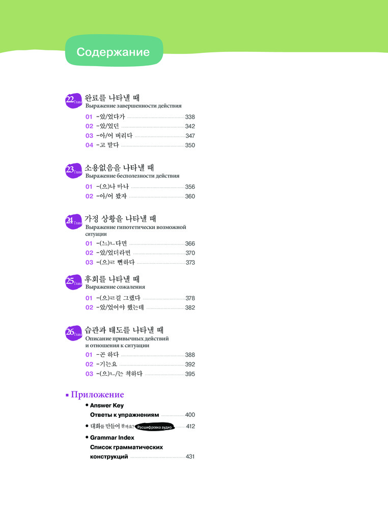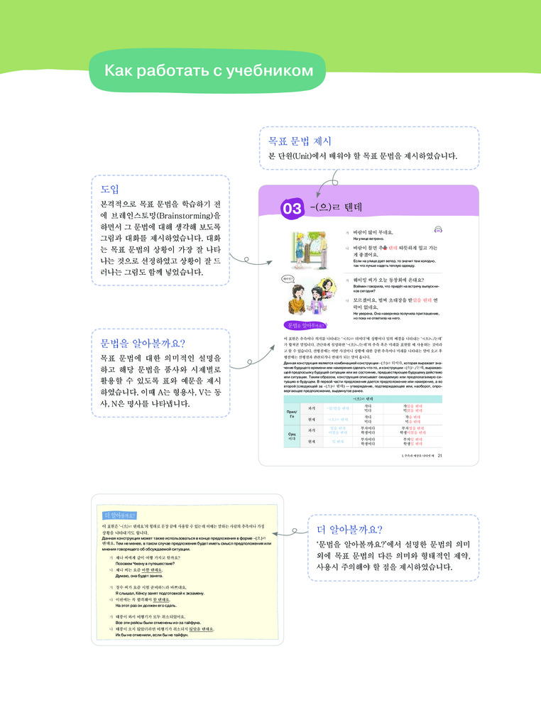 Серия: Школа корейского языка Это первое издание мирового бестселлера «Korean Grammar in Use: Intermediate» на русском языке. Данное пособие содержит 93 явления грамматики корейского языка, которые рассматриваются на 3-м и 4-м уровнях изучения языка в корейских университетах и аккредитованных языковых школах. Все грамматические явления разделены на 26 разделов в соответствии с передаваемыми ими значениями. Помимо грамматического комментария в каждой теме вы найдете диалог, яркие иллюстрации речевых ситуаций, а также упражнения, ключи к которым приведены в конце книги. Все примеры и диалоги озвучены носителями языка и доступны абсолютно бесплатно на сайте российской образовательной платформы Lecta. Книга предназначена для продолжающих изучение корейского языка самостоятельно или на специализированных курсах, а также для преподавателей. |