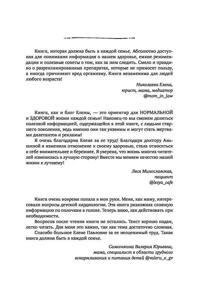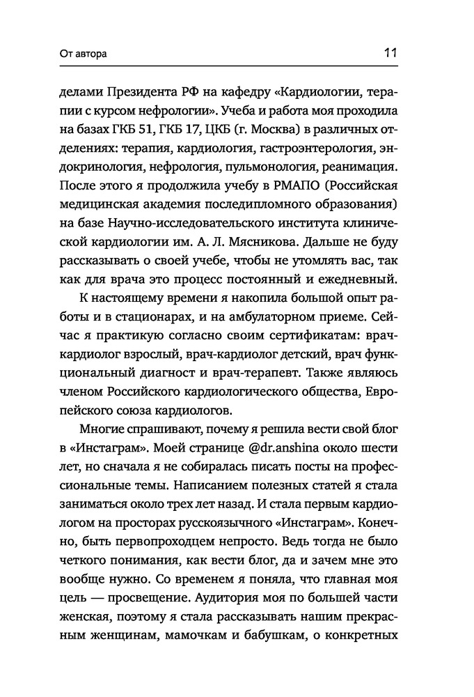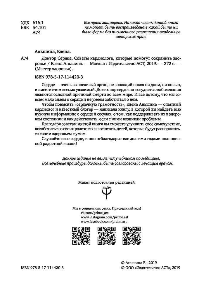 💳 Оплатить за товар можно при получении 🇰🇿 Есть бесплатная доставка по Казахстану 🎁 Копите бонусы с каждой покупки Серия: Мастер здоровья Сердце — очень выносливый орган, не знающий покоя ни днем, ни ночью, и вместе с тем весьма уязвимый. До сих пор сердечно-сосудистые заболевания являются основной причиной смерти во всем мире. И все потому, что мы совсем мало знаем о сердце и не умеем заботиться о нем. Чтобы повысить «сердечную грамотность», Елена Аньшина — опытный кардиолог и известный блогер — написала книгу, в которой вы найдете всю нужную информацию о сердце и сосудах, о том, как поддерживать их в здоровом состоянии и как действовать, если с ними возникли проблемы. Благодаря советам из этой книги вы сможете улучшить свое самочувствие, позаботиться о своих родителях и воспитать детей, которые будут распоряжаться своим здоровьем с умом. Слушайте свое сердце, и оно отблагодарит вас долгими годами полноценной радостной жизни! |