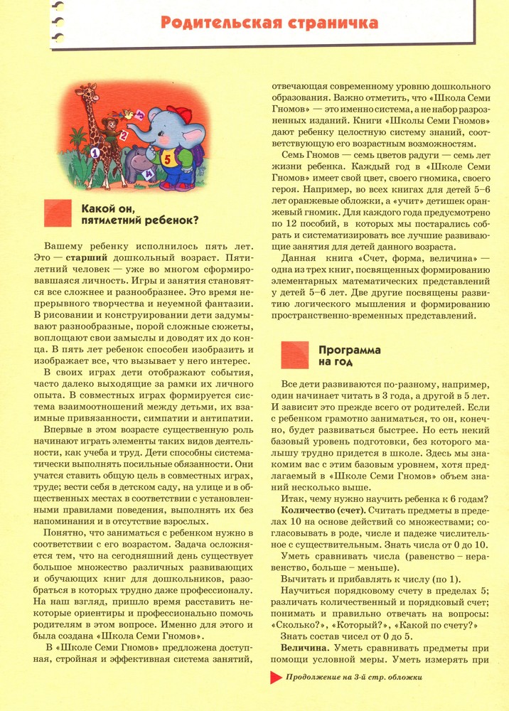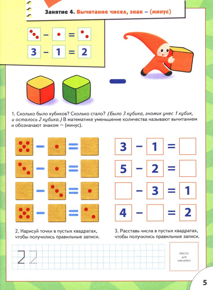 Книга поможет сформировать у ребенка элементарные математические представления и развить логическое мышление. Он научится считать до 10, согласовывать числительное с существительным, сравнивать числа, вычитать и прибавлять к числу по единице. Малыш ознакомится с геометрическими фигурами, научится выделять часть из целого, измерять величину предметов и объем сыпучих и жидких тел.Внутри книги Вы найдете красочные наклейки.Для занятий с детьми от 5 до 6 лет.