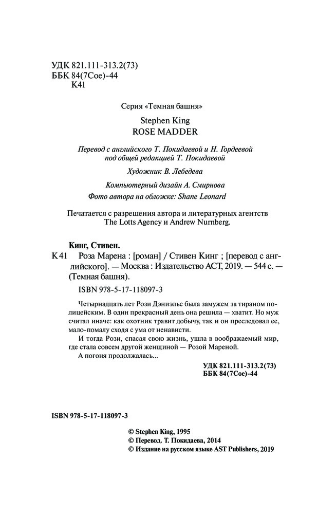 💳 Оплатить за товар можно при получении 🇰🇿 Есть бесплатная доставка по Казахстану от 1 дня 🎁 Копите бонусы с каждой покупки Серия: Темная Башня Четырнадцать лет Рози Дэниэльс была замужем за тираном-полицейским. В один прекрасный день она решила — хватит. Но муж считал иначе: как охотник травит добычу, так он преследовал ее, мало-помалу сходя с ума от ненависти. И тогда Рози, спасая свою жизнь, ушла в воображаемый мир, где стала совсем другой женщиной — Розой Мареной. А погоня продолжалась... |