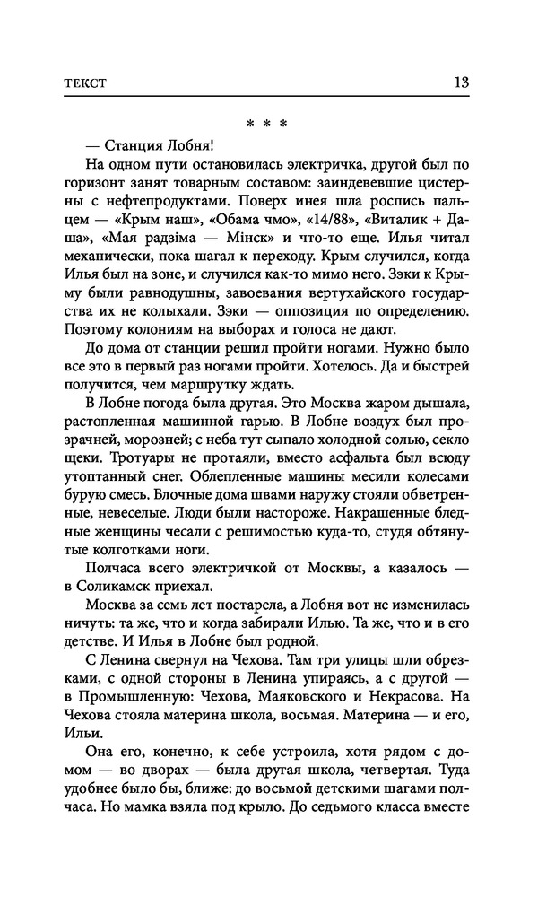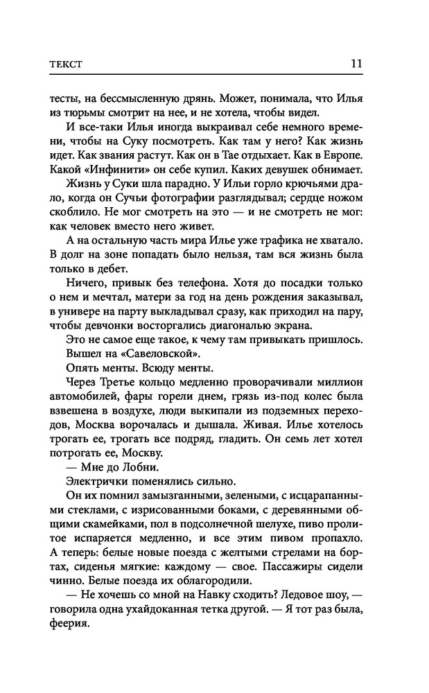 В данный момент этот товар отсутствует в продаже. Возможно, у нас найдется аналогичный или похожий товар здесь. Серия: Кино-книга Студенту филфака МГУ Илье Горюнову молодой полицейский оперативник подбрасывает наркотики, чтобы наказать за строптивость. Отбыв семилетний срок, Илья хочет просто вернуться к нормальной жизни — но вместо этого примеряет на себя жизнь человека, который искалечил ему судьбу... «Текст» — это роман о сегодняшней Москве, о сегодняшней России, о каждом из нас. О нашем бесправии перед «органами», о нашей зависимости от мобильных, о мести и о прощении, о невозможной любви и несбыточных мечтах. Настоящий новый русский роман, которого не появлялось так давно. Всего через два года после выхода в свет «Текст» уже переведен более чем на 20 языков мира, французская и немецкая пресса сравнивают роман с «Преступлением и наказанием», в Московском театре Ермоловой по нему поставлен идущий с аншлагами спектакль — и вот теперь снят фильм с главными молодыми звездами российского кино. Событие, которое нельзя пропустить. |