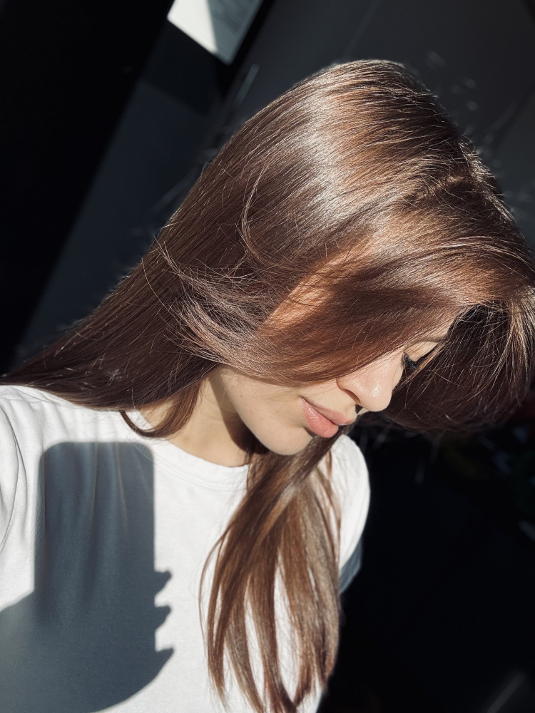 приятный медный оттенок, гладкие волосы