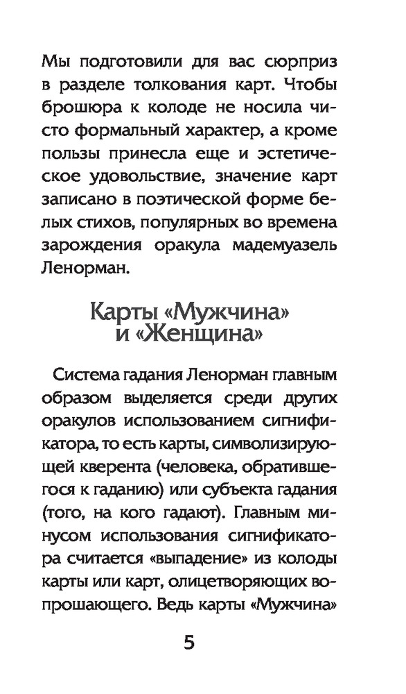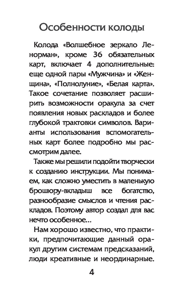 Колода отличная! Тонкие карты, покрытые лаком, что дает возможность прекрасно их тасовать. Рисунки и символы очень хорошо прорисованы, обращают на себя внимание. Отдельно скажу про брошюру-толкования значений. Выполенена необычно, в стихотворной форме. Возможно, не для всех будет понятна, нужна практика классического трактования карт Ленорман. Да, карты не для новичков! А для тех, кто уже имел дело с классической колодой. Мне очень подошли, мне очень понравились, сразу "отозвались". Очень рада, что увидела их здесь.