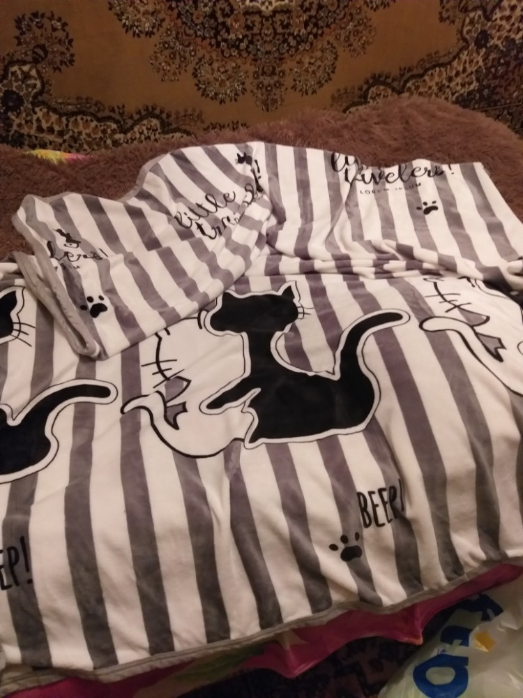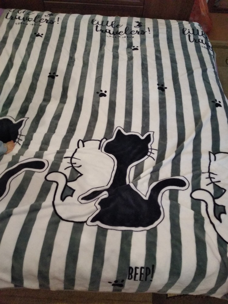 Заказывала для сына. Ему понравился плед. Мягкий, теплый. Расцветка красивая. Милые котики. Супер!