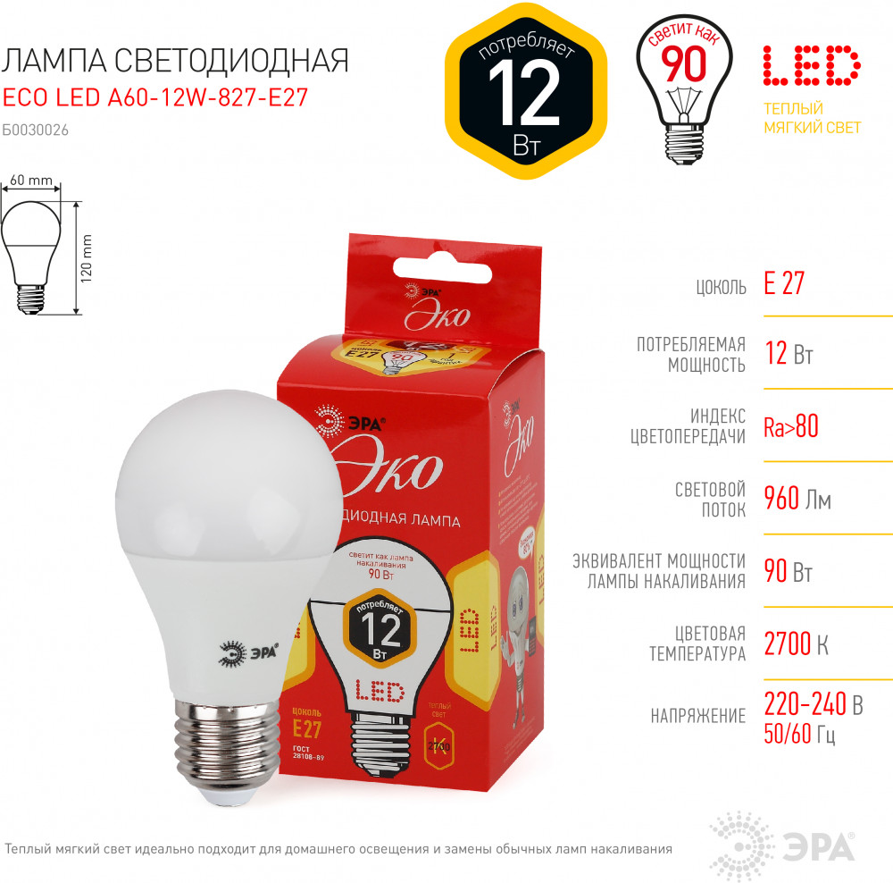 Светодиодная лампа эконом-серии. Линейка этих ламп достаточна для обычного потребителя. Работа в цепи с выключателем с подсветкой не рекомендована. При приобретении представленной модели стоит учитывать, что она удивительно экономична и рассчитана на срок службы до 25 000 часов. Это позволяет пользоваться одной лампочкой долгие годы. Дополнительный плюс — расход электричества представленной моделью не превышает 12 Вт. При этом по яркости света она соответствует стандартной 90-ваттной лампе накаливания.
