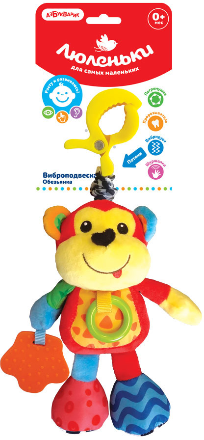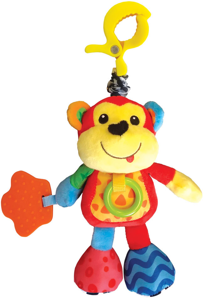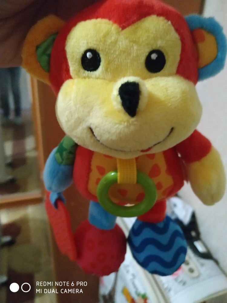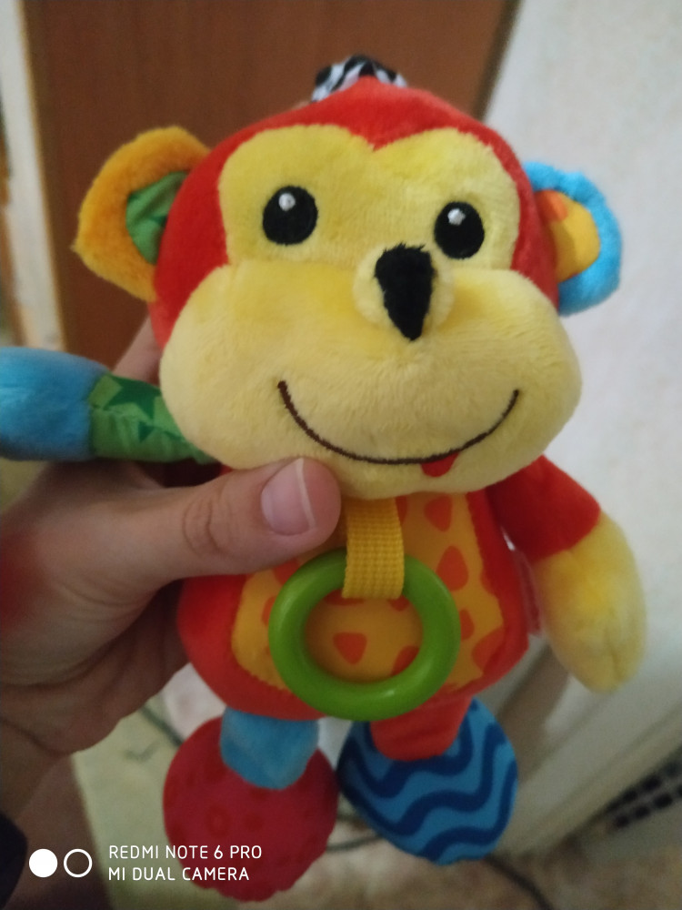 Здравствуйте, игрушка классная-красивая, яркая. Ушки шелестят, во внутри есть погремушка. К лапке прилеплен грызунок. Можно подвесить к коляски или ещё куда-нибудь, при оттягивании прищепки обезьянка вибрирует. Нам очень понравилась эта игрушка.