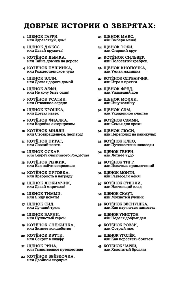 Дай лапу! Большая книга добрых историйВ данный момент этот товар отсутствует в продаже. Возможно, у нас найдется аналогичный или похожий товар здесь. Серия: Детская. Холли Вебб. Добрые истории о зверятах. Мировой бестселлер Щенок Фред, или Уплывший дом Энн обожала каникулы — ведь на каникулах она обычно путешествовала с дедушкой и бабушкой на лодке! Но в этом году есть кое-что новенькое — Фред, щенок Энн. Энн не хочет расставаться со своим питомцем, только у бабушки и дедушки уже есть собака, пожилой и степенный лабрадор. Уживётся ли он с озорным щенком? Щенок Молли, или Ищу хозяйку На пляже Ани познакомилась с дружной семьёй и их щенком Молли. Они весело играли до самого вечера, но на следующий день собачка пришла на пляж... одна. Ани очень удивилась и рассердилась. Она поймала Молли и отправилась на поиски хозяев. Но оказалось, что у её новых знакомых вообще никогда не было собаки. Тогда кто же хозяин Молли? Неужели собачка бездомная? Щенок Люси, или Переполох на каникулах Раньше у Лорен была одна собака, а теперь — целая куча! Ее собака Белла родила щенков, и пока они ещё маленькие, надо помогать Белле заботиться о них. Лорен очень ответственно подошла к этому делу. Особенно девочку волновал один щенок — самый маленький и слабый. Лорен уделяла этой малышке много внимания и, так получилось, что безумно к ней привязалась. Но щенки подросли и пришло время искать им новый дом. Неужели Лорен придется расстаться с так полюбившейся ей крошкой? Щенок Генри, или Летнее чудо Лора не собиралась становиться «собачьей няней», но... так получилось. Хозяйка очаровательного щенка Генри приехала в отпуск и не рассчитала свои силы. Она не смогла как следует заботиться о щенке, поэтому Лора, как ответственная девочка, взяла Генри на себя. Но любой отдых рано или поздно заканчивается. Значит, хозяйка Генри и ее милый питомец уедут. А Лора уже так привязалась к щенку! Да и он к ней. Неужели им предстоит разлука? |