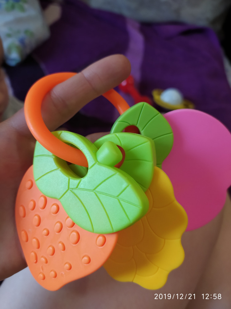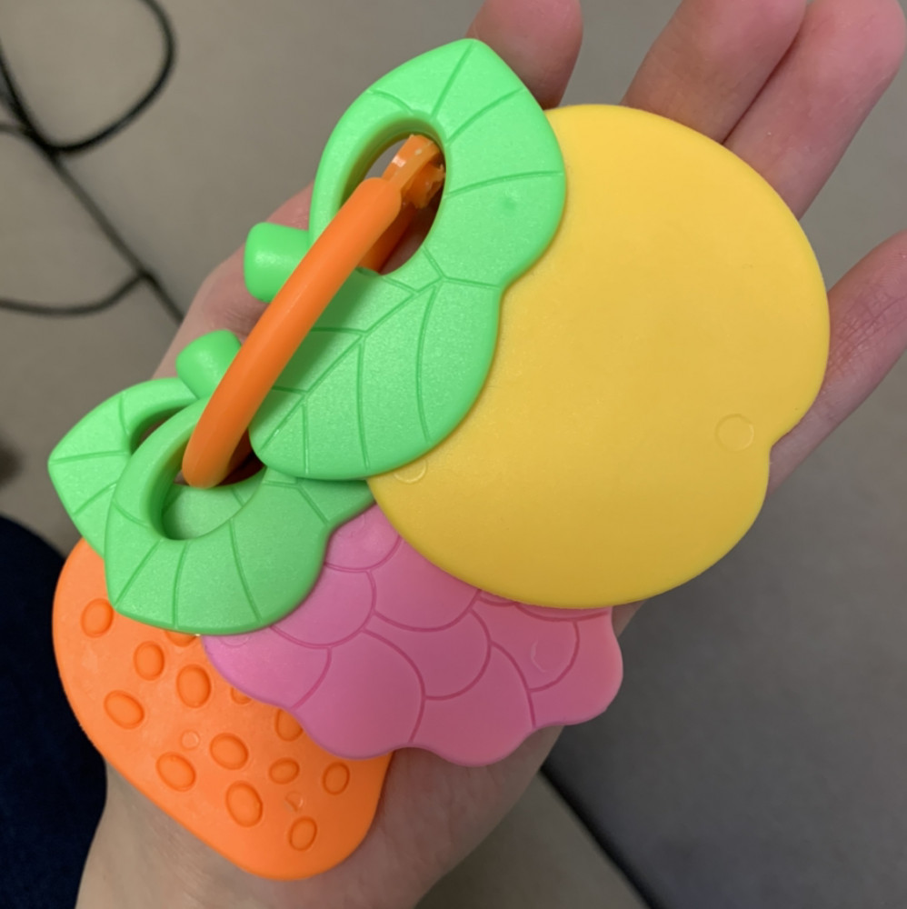 Это не прорезыватель ни в одном месте, листочки пластиковые, толщина примерно 1 см, а вот сами фрукты мягкий пластик ну может 2 мм. Ребенок их даже в рот не берет, просто игрушка.