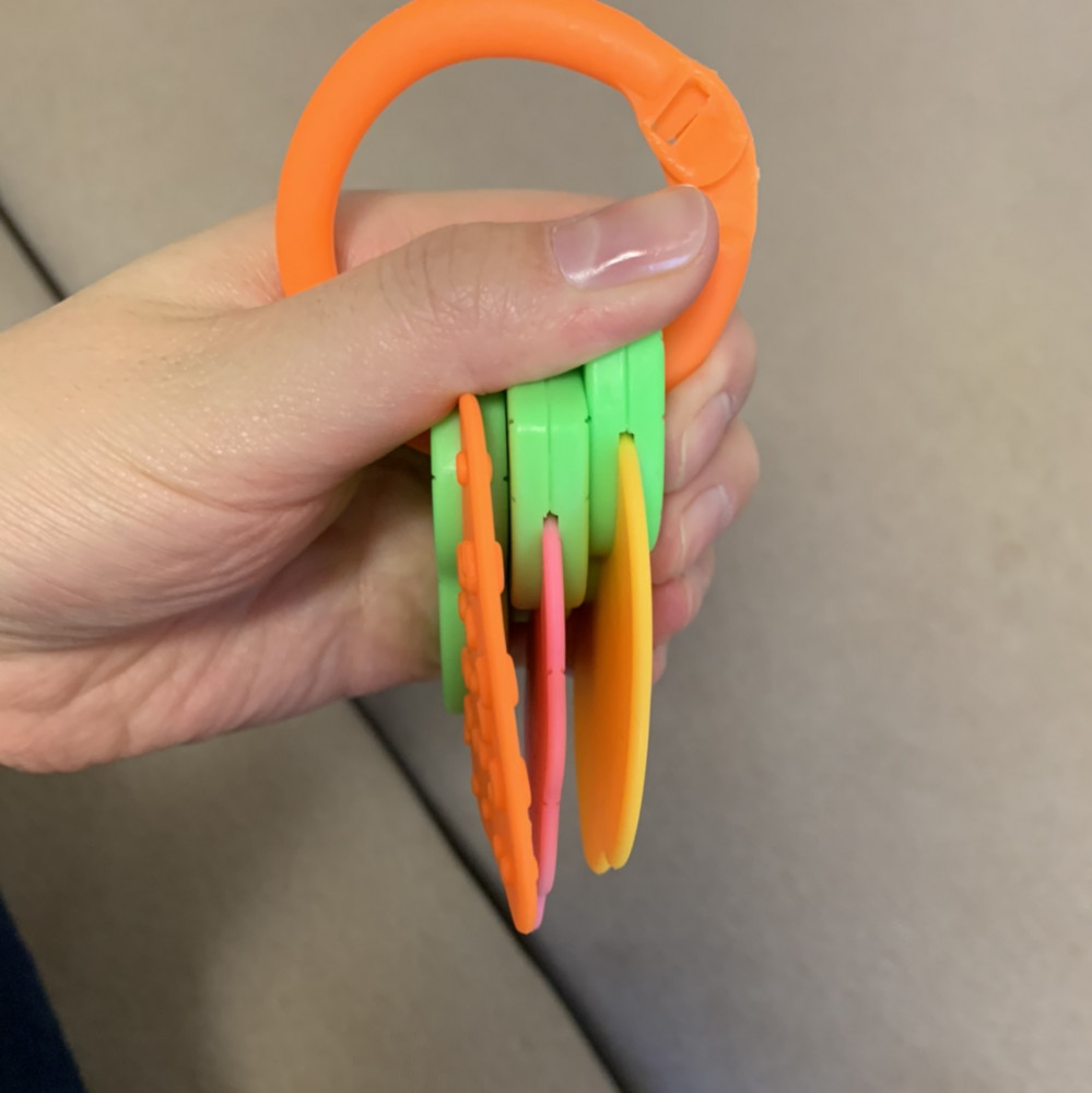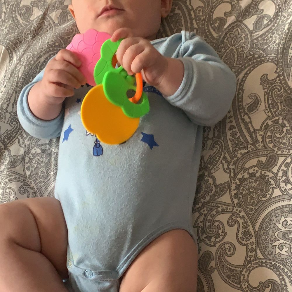Хорошенькие и большие прорезыватели (каждый размером с половину взрослой ладони), гремят друг о друга, привлекая внимание ребенка.