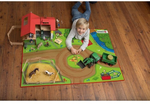 Изделие имеет прямоугольную форму, выполнен в насыщенной цветовой гамме, его можно постелить для игр на полу в детской. На коврике изображена большая ферма лошадей с различными постройками, тропинками, лугами, водоемом, загонами для животных и прочим. Коврик можно использовать в качестве украшения интерьера детской комнаты, в качестве основы композиции для сюжетно-ролевых игр с куклами, машинками и фигурками животных. Изображение на коврике выполнено с высоким уровнем детализации, благодаря обозначениям и разделению игровых зон ребенок сообразит, где ему можно поставить дом фермера, а где поставить фигурки животных. Рисунок коврика не стирается и не выгорает на солнце, за ковриком легко ухаживать и удобно хранить и брать с собой, свернув его в рулон.
