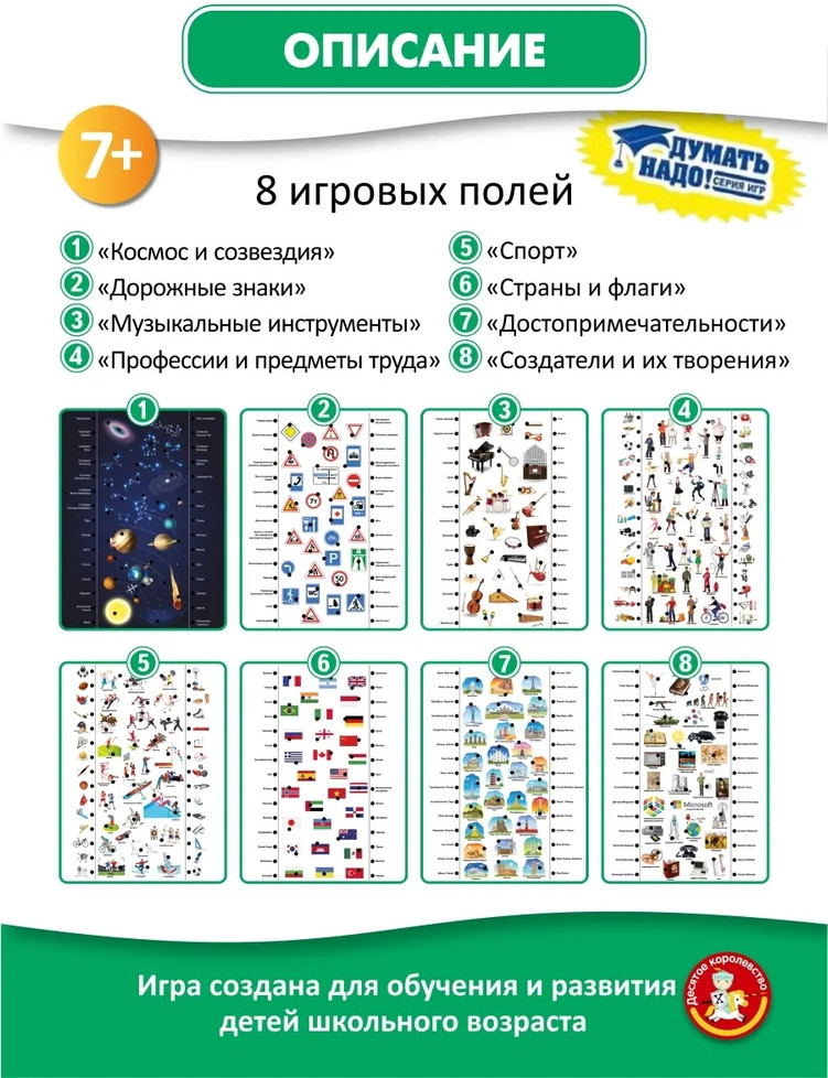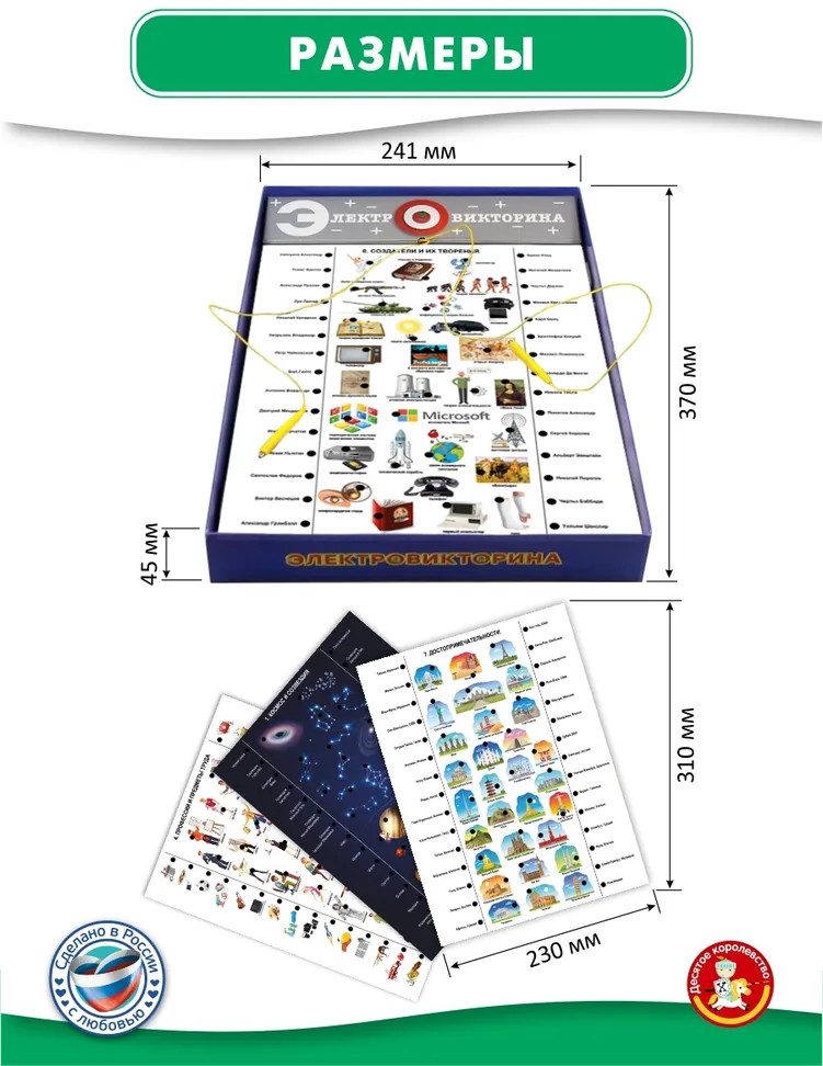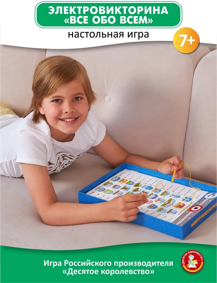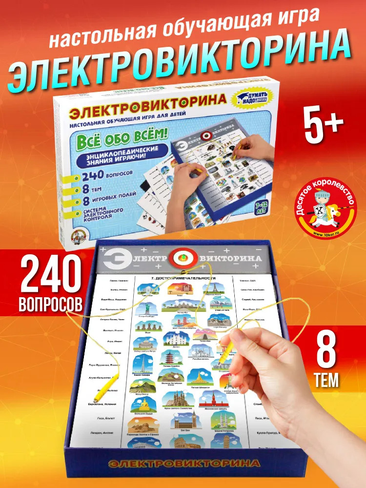 💳 Оплатить за товар можно при получении 🇰🇿 Есть бесплатная доставка по Казахстану от 1 дня 🎁 Копите бонусы с каждой покупки Серия: Электровикторина Получить энциклопедические знания играючи просто! В этом поможет настольная обучающая электровикторина «Все обо всем». Знаете ли вы, как выглядит флаг Камбоджи, ксилофон и пояс астероидов? Сможете ли отличить небе созвездие дракона от созвездия Весов? Где находится город Петра? Чем прославился Эдвин Ленд? На эти и другие вопросы найдутся ответы благодаря интеллектуальной электровикторине «Все обо всем». В увлекательной игровой форме ребенок освоит окружающий мир и его грани, расширит кругозор, потренирует внимание и память. |