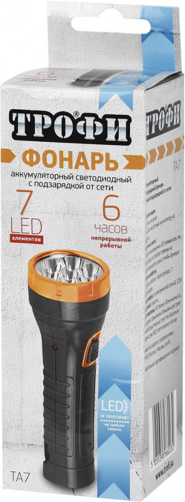ТРОФИ Фонарь ручной Трофи ТA7В данный момент этот товар отсутствует в продаже. Возможно, у нас найдется аналогичный или похожий товар здесь. Трофи ТА7 — компактный аккумуляторный LED-фонарь с 7 белыми светодиодами, двумя режимами работы и прямой подзарядкой от электросети 220 В. Изготовлен из ударопрочных материалов. Имеет ёмкий аккумулятор, который обеспечивает 6 часов непрерывной работы после одного полного заряда. Ровный яркий свет данного фонаря обеспечивают 7 белых светодиодов. |