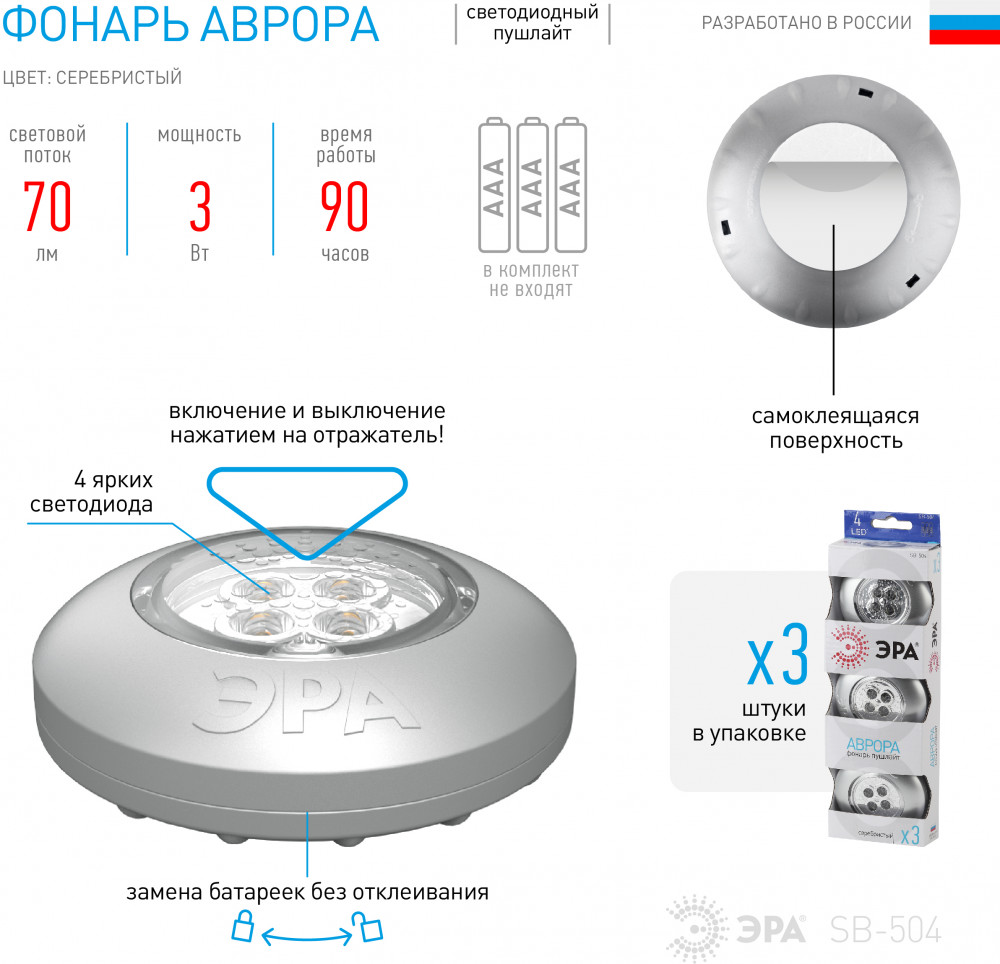💳 Оплатить за товар можно при получении 🇰🇿 Есть бесплатная доставка по Казахстану от 1 дня 🎁 Копите бонусы с каждой покупки Серия: Аврора Пушлайт ЭРА SB-504 «Аврора» — это осветительный прибор, имеющий четыре мощных диода. По форме светильник круглый, корпус серебристого цвета. Прибор работает от батареи. Главное его преимущество — это самоклеящаяся задняя поверхность. Смена батареек происходит без отклеивания, что очень удобно, в комплект входят 3 устройства. |