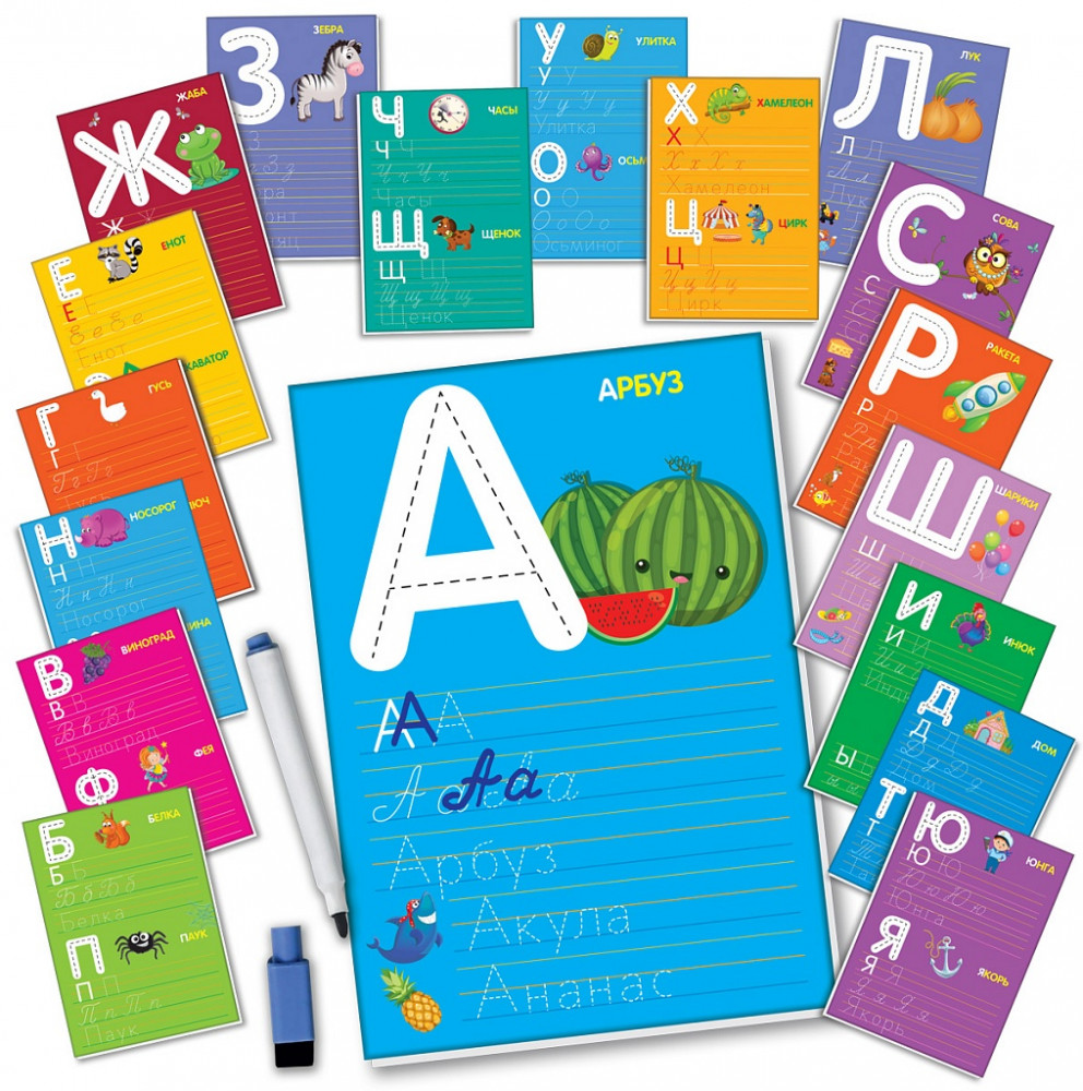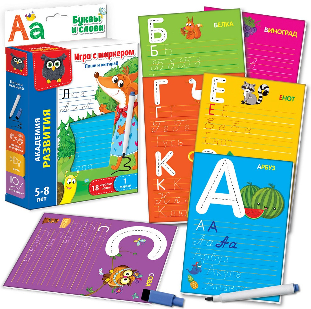 Vladi Toys Набор обучающий «Буквы и слова»В данный момент этот товар отсутствует в продаже. Возможно, у нас найдется аналогичный или похожий товар здесь. На красочных карточках собрались буквы и слова! Нужно лишь взять в руки маркер и «оживить» их! Выбираем карточку, внимательно изучаем букву и обводим ее контуры! После этого пишем букву самостоятельно. Если ребенок сделал ошибку, маркер можно легко стереть и написать заново. В процессе игры малыш быстро запомнит, как пишутся печатные и прописные буквы, научится правильно держать ручку, а также потренирует память, речь и мелкую моторику. А благодаря маркеру «Пиши-вытирай» к пройденному материалу можно возвращаться множество раз. |