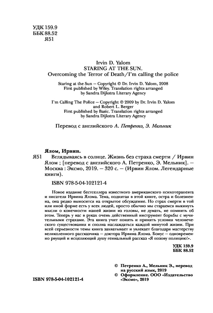 💳 Оплатить за товар можно при получении 🇰🇿 Есть бесплатная доставка по Казахстану 🎁 Копите бонусы с каждой покупки Серия: Ирвин Ялом. Легендарные книги Новое издание бестселлера известного американского психотерапевта и писателя Ирвина Ялома. Тема, поднятая в этой книге, остра и болезненна, она редко выносится на открытое обсуждение. Но страх смерти в той или иной форме есть у всех людей, просто обычно мы стараемся выкинуть мысли о конечности нашей жизни из головы, не думать, не помнить об этом. Теперь у вас в руках очень действенный инструмент борьбы с мучительными страхами. Эта книга учит понять и принять условия человеческого существования и сполна наслаждаться каждой минутой жизни. При всей серьезности темы книга захватывает и увлекает благодаря мастерству великолепного рассказчика — доктора Ирвина Ялома. Бонус — одновременно рвущий и исцеляющий душу гениальный рассказ «Я позову полицию!». |