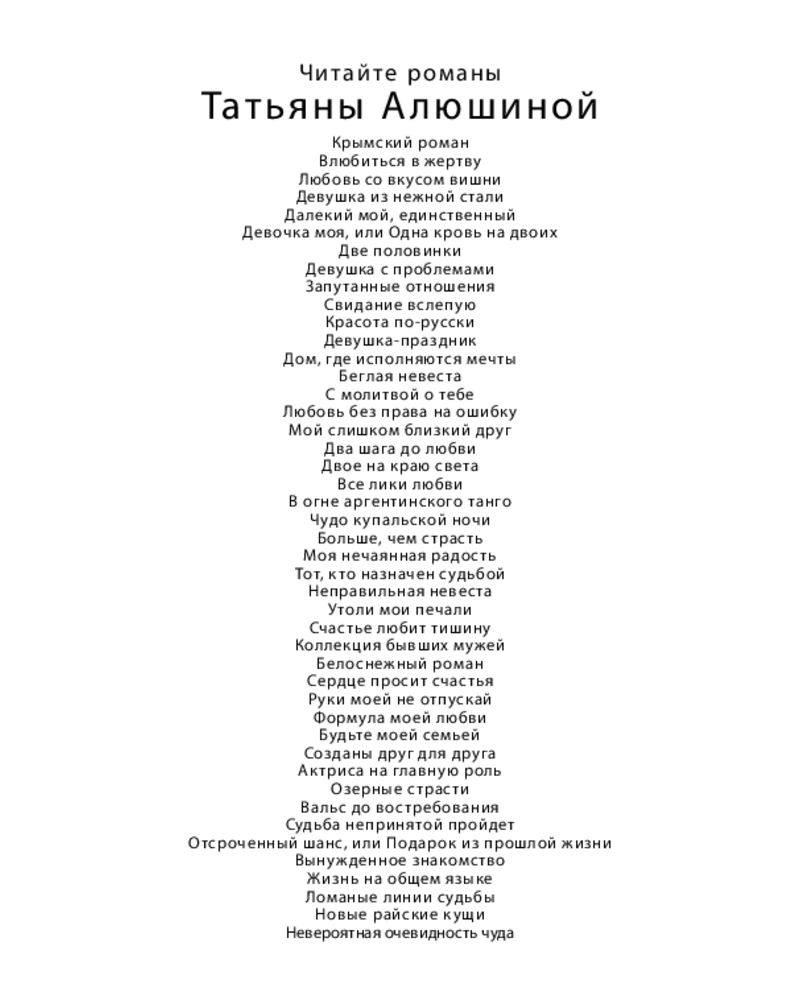 💳 Оплатить за товар можно при получении 🇰🇿 Есть бесплатная доставка по Казахстану от 1 дня 🎁 Копите бонусы с каждой покупки Серия: Еще раз про любовь. Романы Т. Алюшиной. Новое оформление (обложка) Всё началось во время бурана. Ася ехала на машине в Москву к заболевшему мужу и попала в эпицентр стихии. Выход один — переждать в ближайшем поселке. И вот по пути к нему Ася находит застрявший в сугробе джип, а в нем — мужчину на грани жизни и смерти. Что делать? Спасать, конечно, как умеет, все равно скорая приехать не может. И начинается борьба со смертью, долгая и напряженная. Близкие пострадавшего, к которым Асе-таки удалось его доставить, будут очень удивлены, узнав, кто на самом деле эта незнакомка-спасительница... |