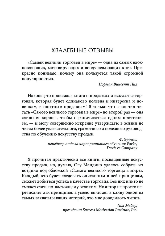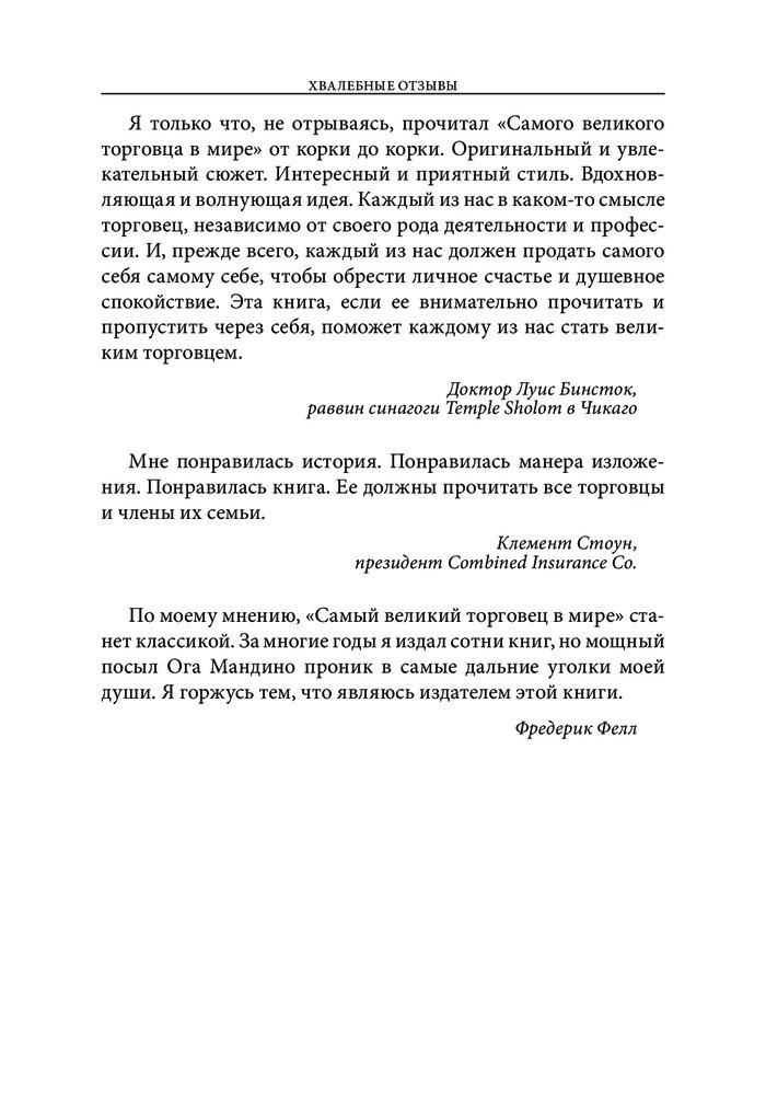 | Ог Мандино "гуру продаж". Его работы, основанные на христианском фундаментализме, находились под большим влиянием Наполеона Хилла и Эмметта Фокса. На сегодняшний день Мандино остается весьма популярным автором. Его книги переведены на более чем двадцать пять различных языков. До 1976 года являлся президентом журнала "Success Unlimited". Во время Второй мировой войны он летал на стратегическом бомбардировщике B-24 Liberator. |