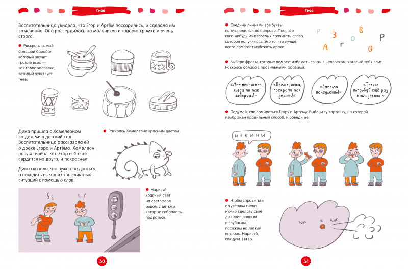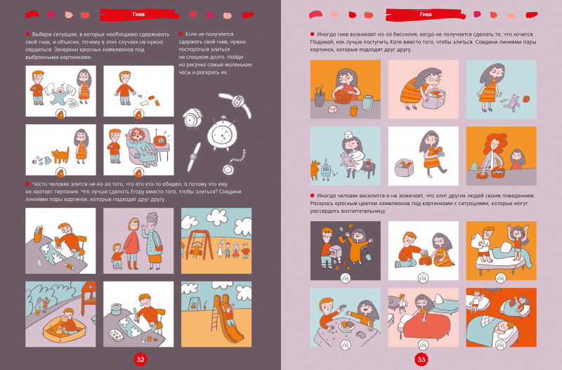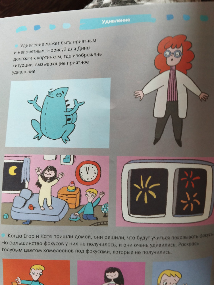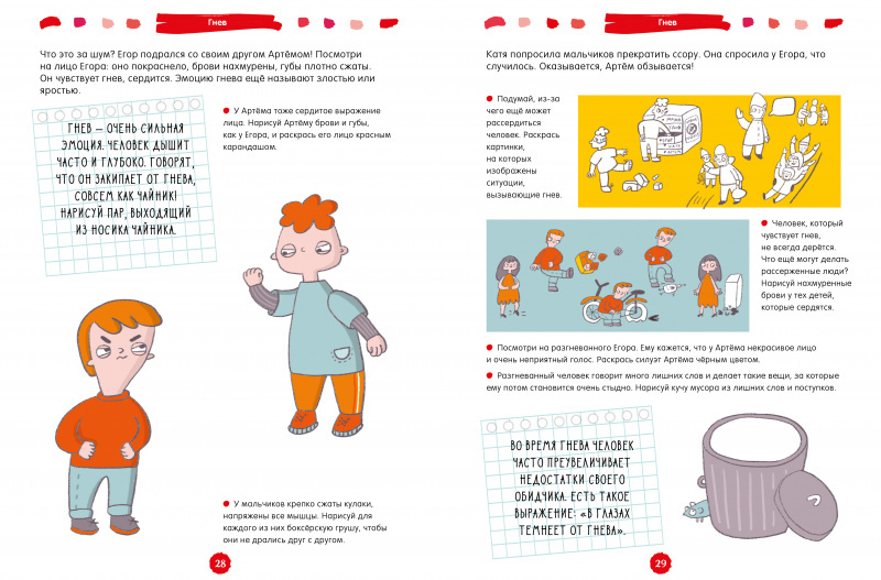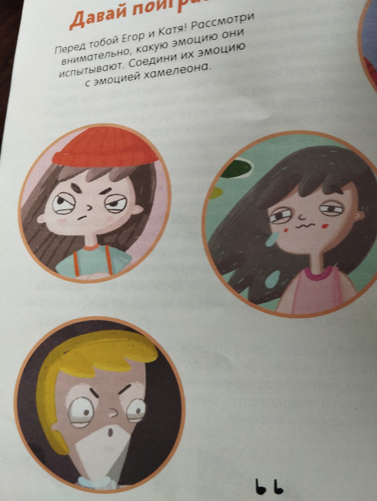 Книга супер - очень интересные задания по эмоциям, очень жизненные ситуации. Очень просто и захватывающе о таком важном, как эмоции. Много где можно рисовать, обсуждать, объяснять. Сын теперь говорит, что злится "прямо сейчас", и знает, как надо реагировать на грусть, радость, гнев, отвращение, удивление. Кинга объясняет как понять других, и общаться с другими так, чтобы не было обидно ни тебе, ни другому. Рекомендую!