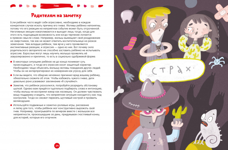 В книге рассказано о 6 основных эмоциях. Страницы каждой главы помечены своим цветом. Есть информация об эмоциональном интеллекте. И рекомендации родителям по развитию эмоции. В конце книги - игра на узнавание эмоций по картинкам.