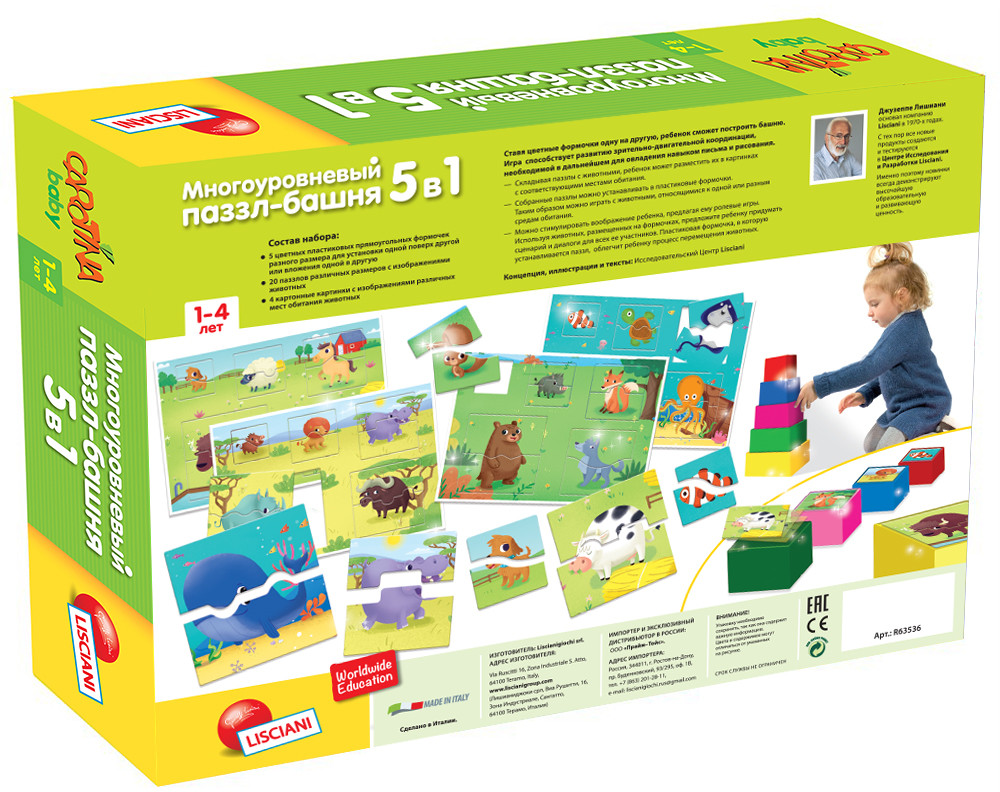 Lisciani Пазл многоуровневый «Башня»В данный момент этот товар отсутствует в продаже. Возможно, у нас найдется аналогичный или похожий товар здесь. Серия: Carotina Baby Набор содержит цветные формочки разного размера и 4 карточки с изображением разных мест обитания. Карточки содержат 20 мини-пазлов различных размеров с разными видами соединения и изображениями животных. Пазлы совпадают по размеру с формочками, поэтому ребенок может собирать их как на формочках, так и внутри карточек. Также из цветных формочек можно построить башню или складывать их одну в другую. |