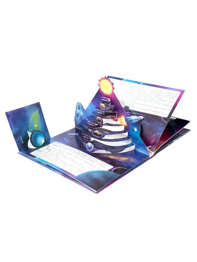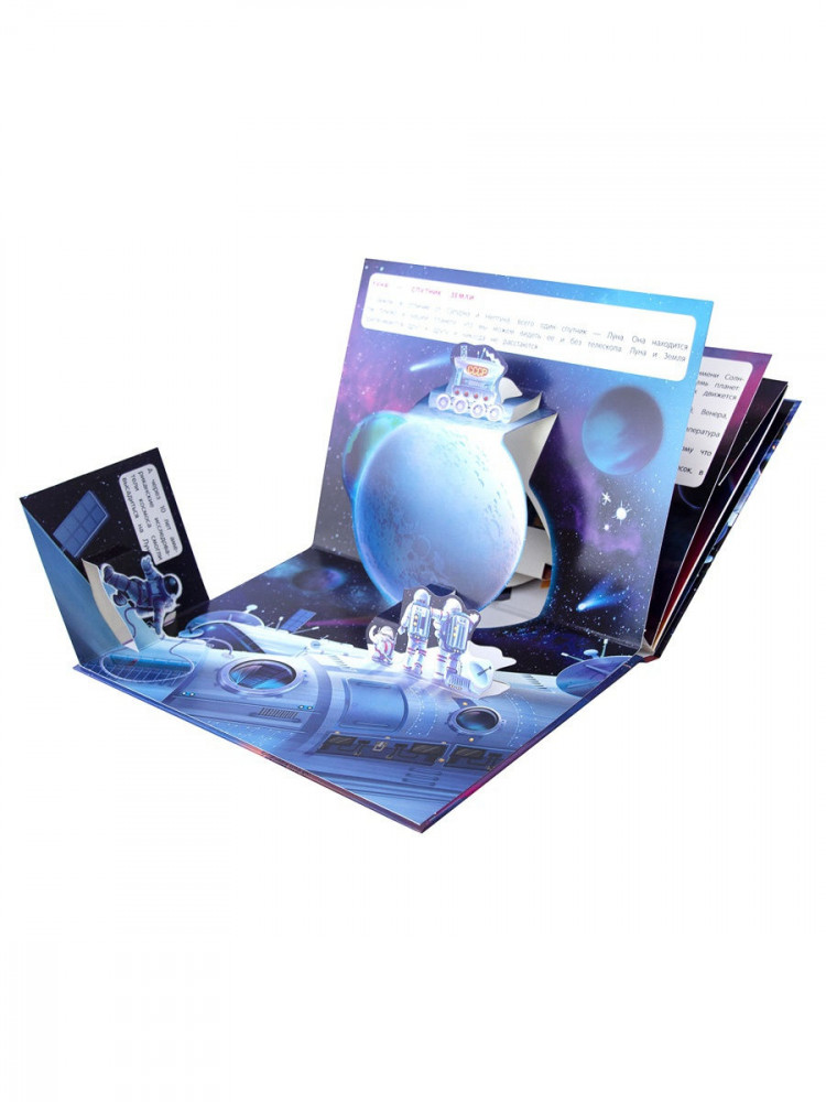 Я к книжкам-панорамам относилась скептически, но на практике книга увлекла детей, вызвала восторг своими иллюстрациями. Информация изложена четко, дозированно, конкретно. Побуждает у ребёнка интерес к теме «космос». Основные темы: Галилей и его открытие телескопа, Солнечная система, что такое обсерватория, космостанция. Для детей от 4 до 8 лет вполне достаточно.