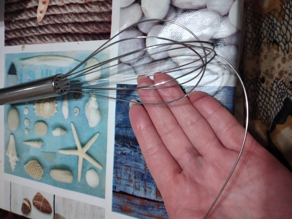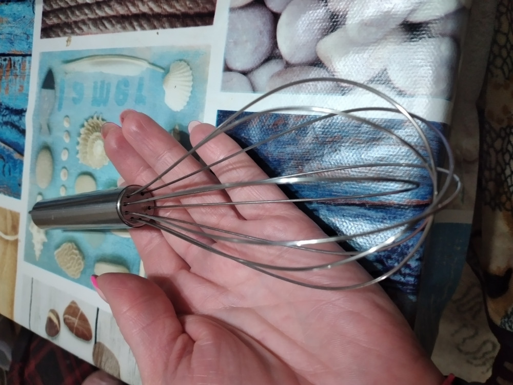 Подумала: раз металлический, то прочный. Но на втором пироге, при перемешивании теста, вылез один прутик((( к сожалению. Вставила обратно, если потихоньку мешать, то держится. А так легкий и размер удобный для руки
