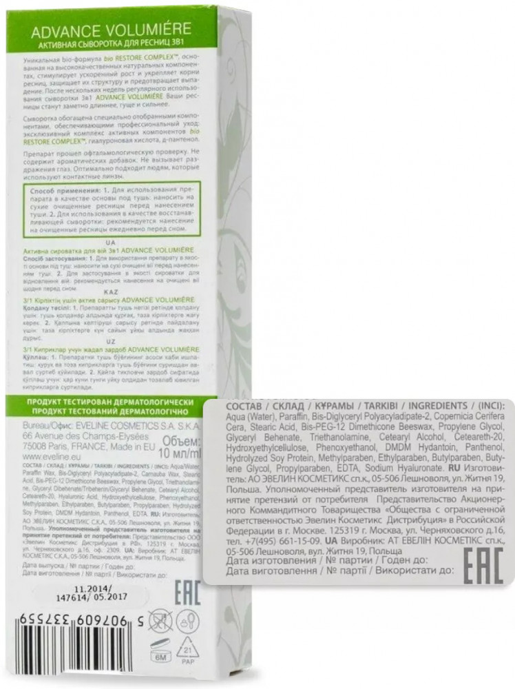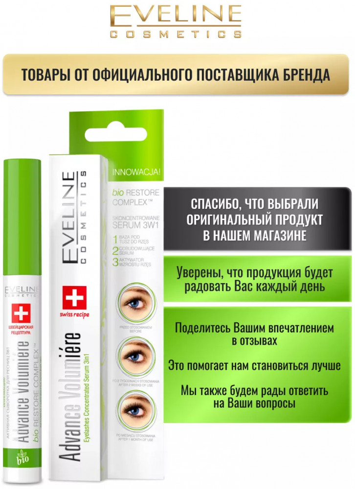 Пользуюсь как база под тушь, это просто маст хэв, удлиняет ресницы - любая тушь ложится лучше. Пользуюсь ей больше 10 лет. Не важно какая именно сыворотка от эвилайн, принцип один у них. Беру какая есть.