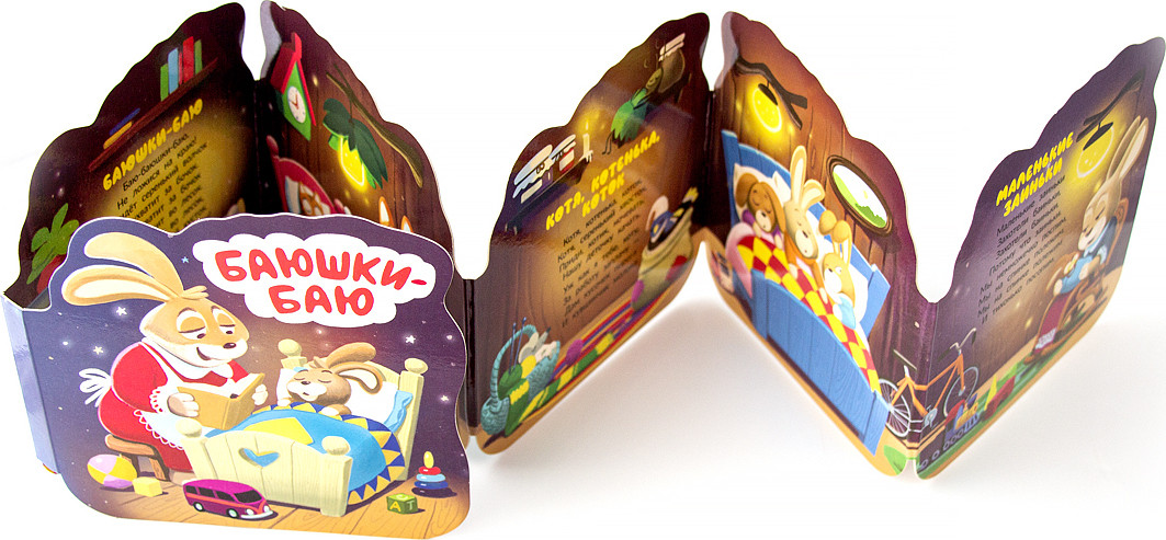 Книжка разворачивается в длинную ленту. Содержит 4 коротенькие колыбельные. Картон довольно плотный (сразу не порвется))Для малышей в самый раз.