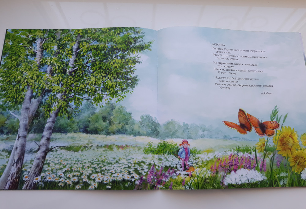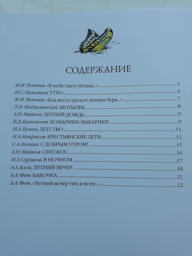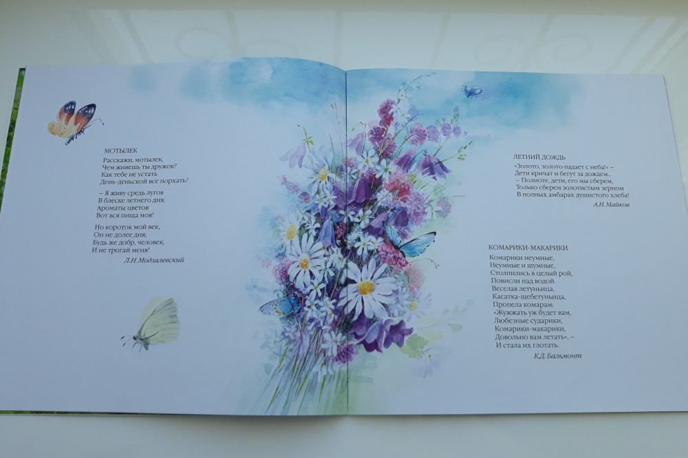 Рекомендую! Хорошая подборка летних стихов и очень достойные иллюстрации. Формат очень большой, качество на высоте. Листы - плотная белоснежная меловка. Книга в мягкой обложке на скрепке.