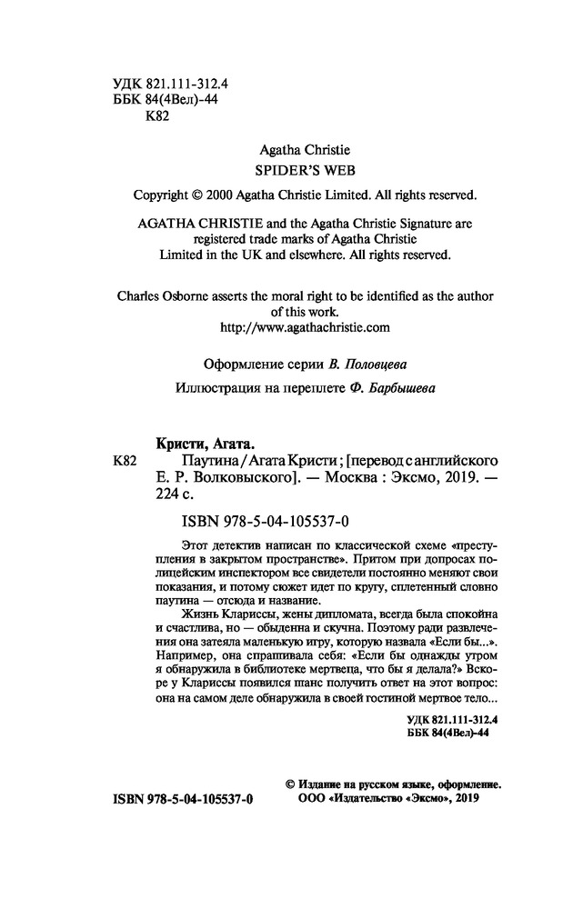 ПаутинаВ данный момент этот товар отсутствует в продаже. Возможно, у нас найдется аналогичный или похожий товар здесь. Серия: Агата Кристи. Первая леди детектива Этот детектив написан по классической схеме «преступления в закрытом пространстве». Притом при допросах полицейского инспектора все свидетели постоянно меняют свои показания, и потому сюжет идет по кругу, сплетенный словно паутина, — отсюда и название. Жизнь Клариссы, жены дипломата, всегда была спокойна и счастлива, но — обыденна и скучна. Поэтому, ради развлечения, она затеяла маленькую игру, которую назвала «Если бы...». Например, она спрашивала себя: «Если бы однажды утром я обнаружила в библиотеке мертвеца, что бы я делала?» Вскоре у Клариссы появился шанс получить ответ на этот вопрос: она на самом деле обнаружила в своей гостиной мертвое тело... |