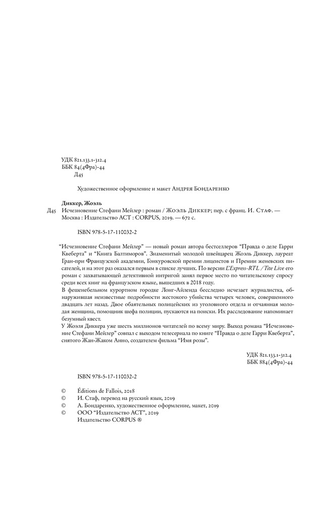 Прочитала за три дня. Книга отличная, ничуть не хуже чем "Правда о деле Гарри Квеберта" и "Книга Балтиморов". Надеюсь, что автор продолжит писать и радовать другими произведениями.