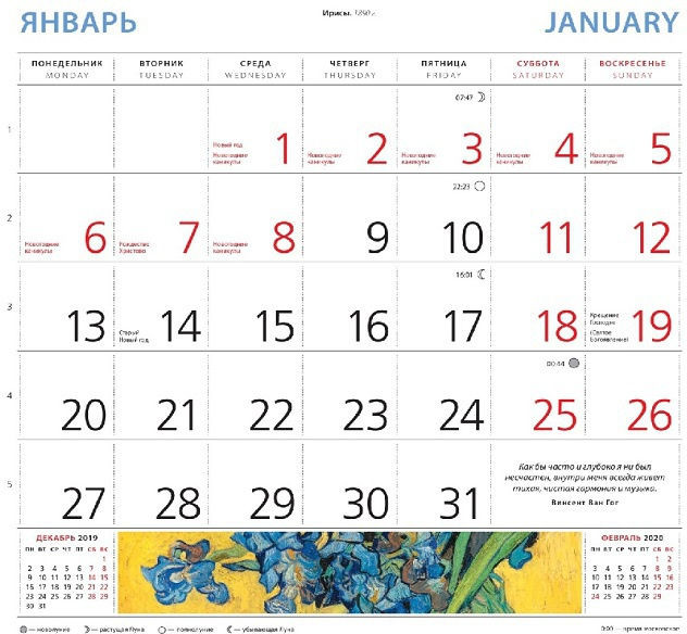 Календарь настенный на 2020 год «Ван Гог»В данный момент этот товар отсутствует в продаже. Возможно, у нас найдется аналогичный или похожий товар здесь. Серия: Календари настенные 2020 Практичный и прекрасно иллюстрированный календарь призван украсить интерьер вашего дома и наполнить его светом знаменитых шедевров мирового искусства. Сетка календаря составлена с учетом потребностей делового человека: в ней отмечены государственные праздники и оставлено место для заметок на каждый день. А безупречные с точки зрения качества рисунки будут радовать вас весь год! |
