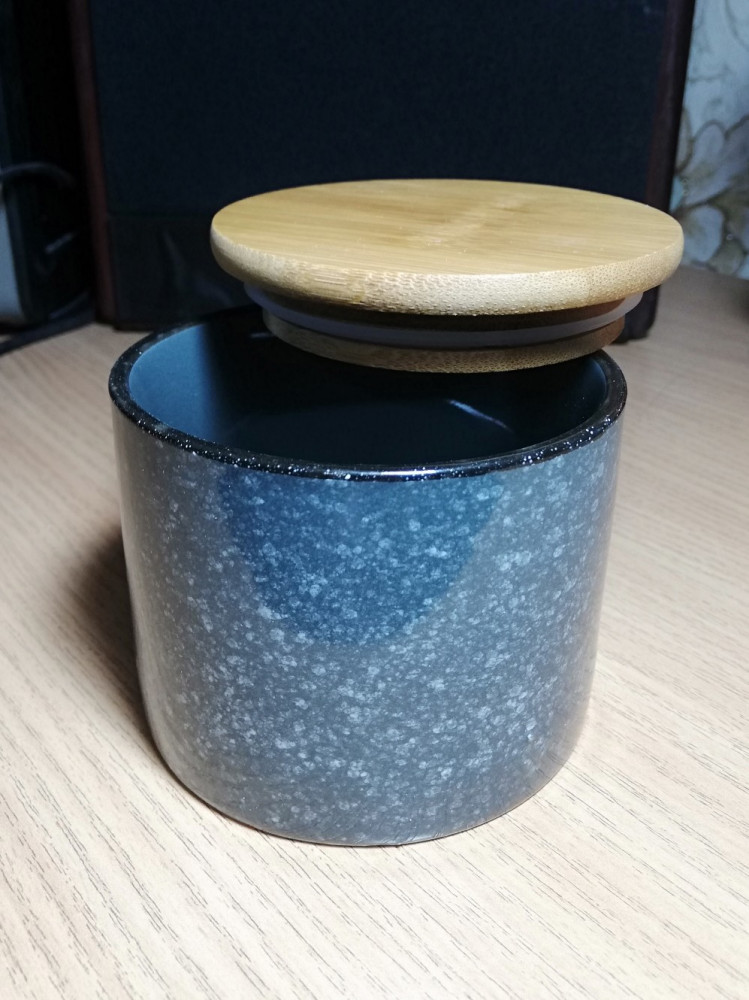 Классный, керамика отличного качества. Цвет серый с белесыми пятнышками. Крышка из прессованого бамбука.
