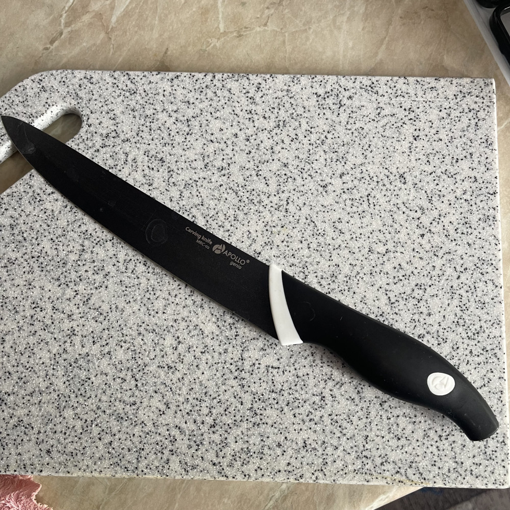 Отличный нож, острый, длинный, режет идеально и овощи и мясо. Сталь не гнется, черная с блестящей рабочей поверхностью. Очень качественно сделанное изделие. Беру ножи этого производителя, все хороши.