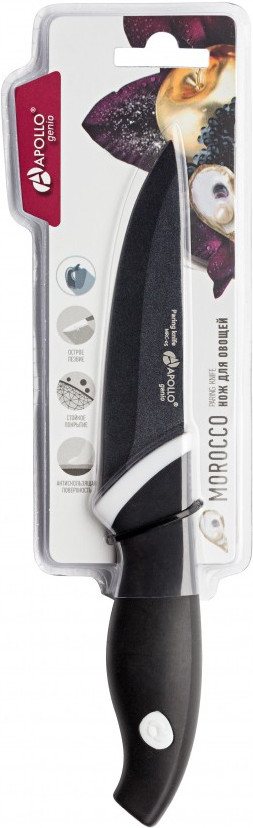 Apollo Genio Нож для овощей «Morocco»В данный момент этот товар отсутствует в продаже. Возможно, у нас найдется аналогичный или похожий товар здесь. Серия: Morocco Нож для овощей изготовлен из высококачественной нержавеющей стали, обеспечивающей долгое сохранение заточки. Стойкое покрытие лезвия защищает металл от воздействий внешней среды, увеличивая тем самым срок службы ножа. Специальное не стираемое антибактериальное покрытие препятствует контакту продукта и стали, уменьшая процесс окисления и значительно увеличивая гигиенические свойства ножей. Форма рукоятки выполнена с учетом анатомии человеческой руки и удобна в работе. TPR пластик делает рукоятку мягкой и приятной на ощупь, не дает ножу выскользнуть из руки. |