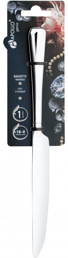 Apollo Genio Нож столовый «Baguette Nouveau»В данный момент этот товар отсутствует в продаже. Возможно, у нас найдется аналогичный или похожий товар здесь. Серия: Baguette Nouveau Нож выполнен из высококачественной нержавеющей стали 18-0. Утонченные, привлекательные изогнутые линии приборов объединяют в себе отличную эргономику и изысканный внешней вид. Нож столовый «Baguette Nouveau» — это возвращение к сбалансированным, правильным пропорциям рабочей части и ручки. Сервировка праздничного стола таким набором станет великолепным украшением любого торжества. |