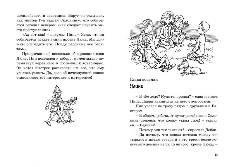 Серия: Пять юных сыщиков и пёс-детектив Пять юных сыщиков снова собираются вместе на летних каникулах. В этот раз они расследуют таинственное исчезновение дорогой сиамской кошки — питомицы леди Кэндлинг, новой соседки Пипа и Бетси. Полицейский А-ну-ка-разойдись и сварливый садовник мистер Склокинг уже готовы обвинить в краже помощника садовника Люка, но сыщики отказываются верить, что этот добродушный паренёк — вор. Кто же тогда украл кошку? |