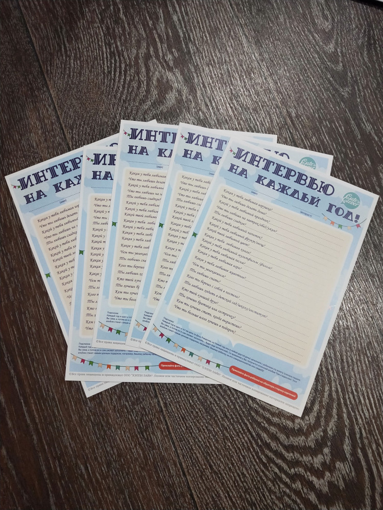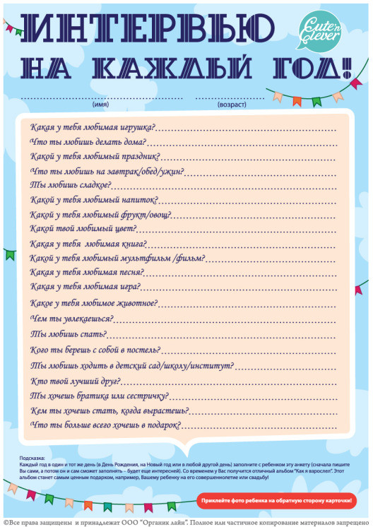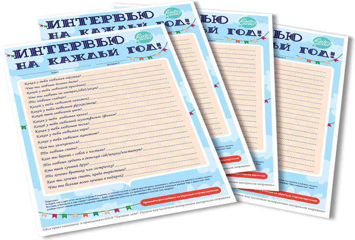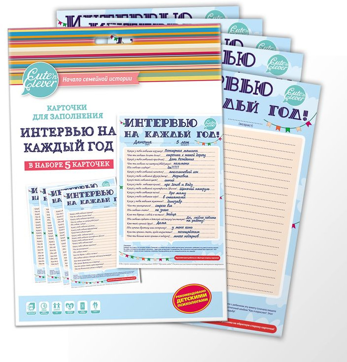 Десятое королевство Набор карточек «Интервью на каждый год»В данный момент этот товар отсутствует в продаже. Возможно, у нас найдется аналогичный или похожий товар здесь. Каждый год желательно в один и тот же день взрослый проводит с ребенком интервью, задавая одни и те же вопросы из карточки и вписывая ответы. Позже малыш сам сможет вписывать. А на обратную сторону интервью мы рекомендуем приклеивать фото ребенка в этот год. |