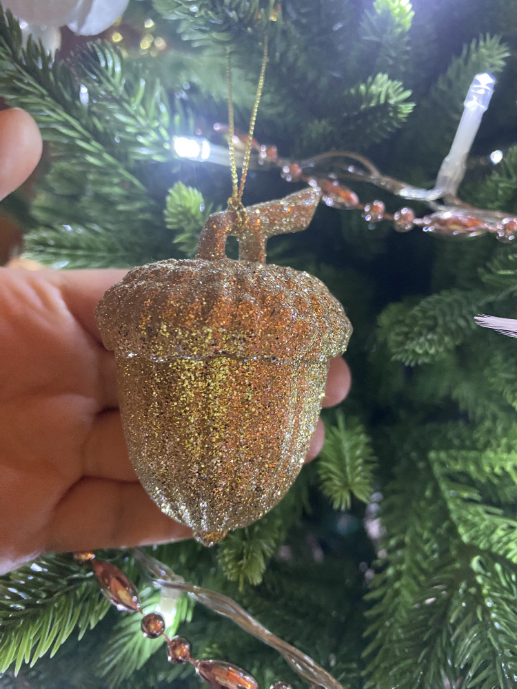 Жёлудь красивый. Материал изделия акрил, посыпанный блёстками. Но размер изделия совершенно не соответствует заявленным. Он максимально 8 см, но никак не 11. Обращайте, пожалуйста, внимание на информацию, которую вы указываете в описании товара. Этот факт меня расстроил. За что я и сняла звёзды. В целом жёлудь хоть и мелкий, но симпатичный. Немного тяжеловат. Смотрится на ёлке неплохо.