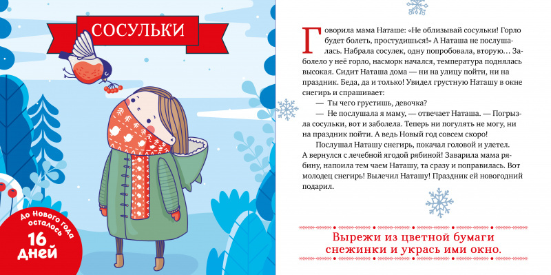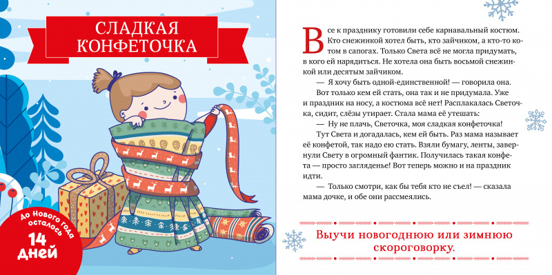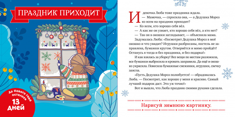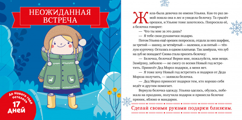 Книга очень хорошая. Истории короткие, меня это сначала удивило, не связаны между собой, но прочитав первую историю, потом вторую, третью, я поняла замысел автора. Каждая коротенькая история несёт в себе такой большой и важный смысл! Учит верить в чудеса, создавать их своими руками, совершать добрые, благородные поступки! И это в нескольких десятках фраз! Автор просто умница!!! На каждой странице написано, сколько осталось до Нового Года, это и есть Адвент календарь. И задания после каждого рассказа - нарядить ёлку, сделать украшение, открытку, придумать игру. Каждый фрагмент странички наполнен смыслом, нет лишних деталей и ненужных слов. И диапазон возрастов ребенка, кому будет интересна эта книга, просто неограниченный! Маленькому будет интересно слушать и смотреть яркие картинки, старшим интересно самим читать, выполнять задания, считать дни! Мне, взрослой, тоже очень интересно читать новые истории каждый день! Однозначно, рекомендую эту книгу каждому!