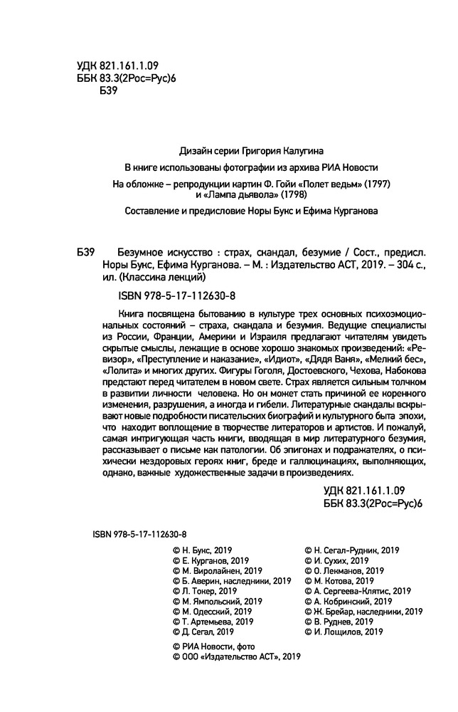 Безумное искусство. Страх, скандал, безумиеВ данный момент этот товар отсутствует в продаже. Возможно, у нас найдется аналогичный или похожий товар здесь. Серия: Классика лекций Книга посвящена бытованию в культуре трех основных психоэмоциональных состояний — страха, скандала и безумия. Ведущие специалисты из России, Франции, Америки и Израиля предлагают читателям увидеть скрытые смыслы, лежащие в основе хорошо знакомых произведений: «Ревизор», «Преступление и наказание», «Идиот», «Дядя Ваня», «Мелкий бес», «Лолита» и многих других. Фигуры Гоголя, Достоевского, Чехова, Набокова предстают перед читателем в новом свете. Страх является сильным толчком в развитии личности человека. Но он может стать причиной ее коренного изменения, разрушения, а иногда и гибели. Литературные скандалы вскрывают новые подробности писательских биографий и культурного быта эпохи, что находит воплощение в творчестве литераторов и артистов. И пожалуй, самая интригующая часть книги, вводящая в мир литературного безумия, рассказывает о письме как патологии. Об эпигонах и подражателях, о психически нездоровых героях книг, бреде и галлюцинациях, выполняющих, однако, важные художественные задачи в произведениях. |